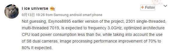 Ähnlich wie der Snapdragon 653-Leak vom Wochenbeginn, stammt das Gerücht, wie soll es anders sein, aus China. Dem neuen Leak auf Weibo zufolge dürfte der Exynos 8895, der womöglich bis zum Start noch umbenannt wird, bereits im 10 nm-Verfahren produziert werden und damit deutlich stärker energiesparend sein, als der Vorgänger. Nicht mehr als 5 Watt soll der Chip angeblich verbrauchen und dabei sogar 3 Ghz erreichen. Benchmarkwerte wurden gleich frei Haus mitgeliefert, 2301 im single-core- und 7019 im multi-core-test wurden angeblich erreicht, behauptet der Leaker.