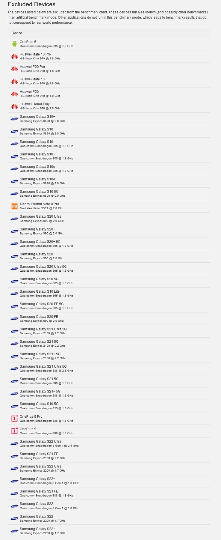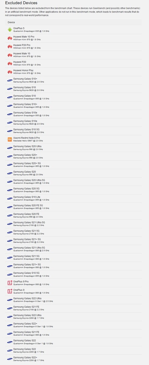 Im Benchmark-Ranking zeigt sich das Ergebnis des Samsung-Banns nun deutlich. Die Liste der "ausgeschlossenen Geräte" am Ende der Android-Charts ist nun um insgesamt 20 Galaxy-Phones angewachsen. Eigentlich sind es sogar 24, wenn man die unterschiedlichen Exynos- und Snapdragon-Versionen mit einrechnet (siehe Screenshot unten).