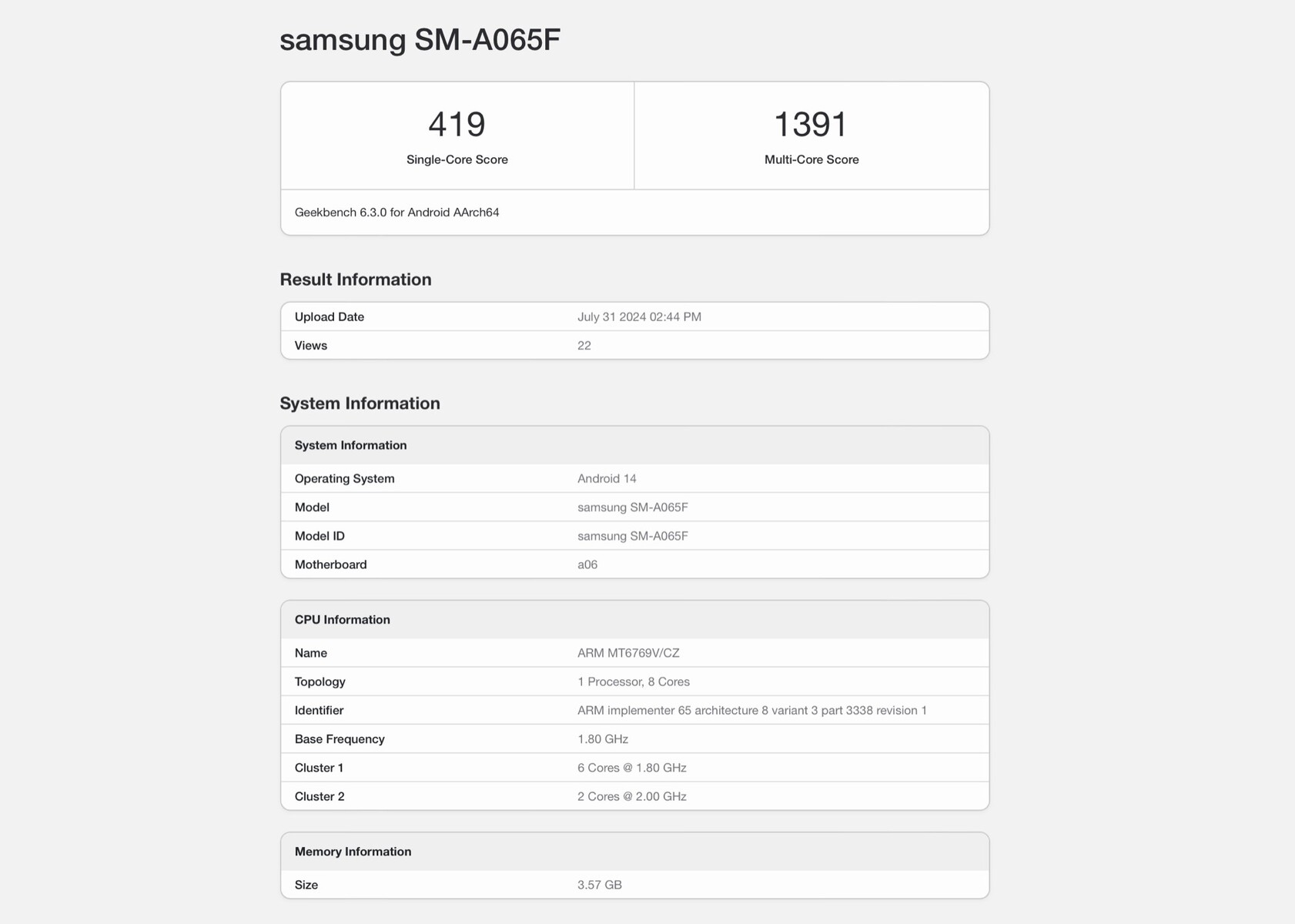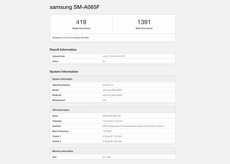 Wie Geekbench 6 zeigt, setzt das Galaxy A06 auf den MediaTek Helio G85, der auch schon beim Galaxy A05 zum Einsatz gekommen ist. Der rund vier Jahre alte 12 nm ARM-Chip verzichtet auf ein 5G-Modem, besitzt aber immerhin zwei Cortex-A75 Performance-Kerne, die mit sechs Cortex-A55 Effizienz-Kernen kombiniert werden. Die getestete Variante des Galaxy A06 besitzt 4 GB Arbeitsspeicher.