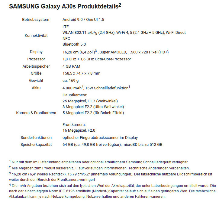 Zudem baut Samsung seinem Galaxy A30s-Smartphone einen langlebigen 4.000-mAh-Akku ein, der 15-Watt-Schnellladen unterstützt. Angetrieben wird das Samsung Galaxy A30s von einem nicht näher bezeichneten Octacore-Prozessor in Kombination mit 4/64 GB Speicher. Via microSD-Karten lässt sich der interne Speicher des A30s um bis zu 512 GB erweitern.
