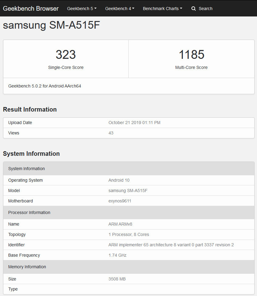 In einigen Gerüchten und Spekulationen wurde bislang davon ausgegangen, dass das Samsung Galaxy A51 möglicherweise den Next-Gen Exynos 9630 erhalten wird. Im Bericht von Galaxyclub.nl heißt es, dass die Midranger Galaxy A51 und Galaxy A71 von Samsung angeblich den neuen und effizienteren Exynos-SoC erhalten sollen. Gemäß Geekbench hat das SM-A515F 4 GB Arbeitsspeicher an Bord. Als Mobile-OS läuft Googles Android 10.