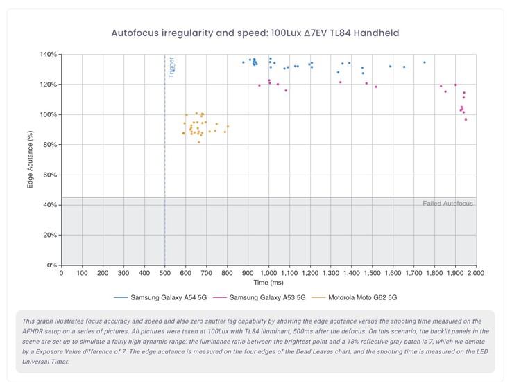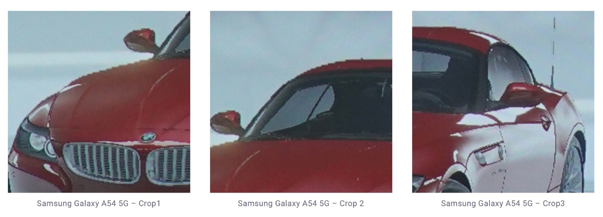 Das Samsung Galaxy A54 besitzt eine 50 MP f/1.8 Hauptkamera, eine 12 MP f/2.2 Ultraweitwinkel-Kamera und ein 5 MP Makro-Kamera. Mangels Tele-Kamera ist es kaum verwunderlich, dass die Qualität von Zoom-Fotos nicht überzeugt, denn dazu muss sich das Galaxy A54 ausschließlich auf digitalen Zoom verlassen. DxOMark kritisiert auch sichtbares Bildrauschen, Autofokus-Probleme, einen teils wenig akkuraten Bokeh-Effekt und die Tatsache, dass die Vorschau der Kamera-App teils stark vom aufgenommenen Foto abweicht.