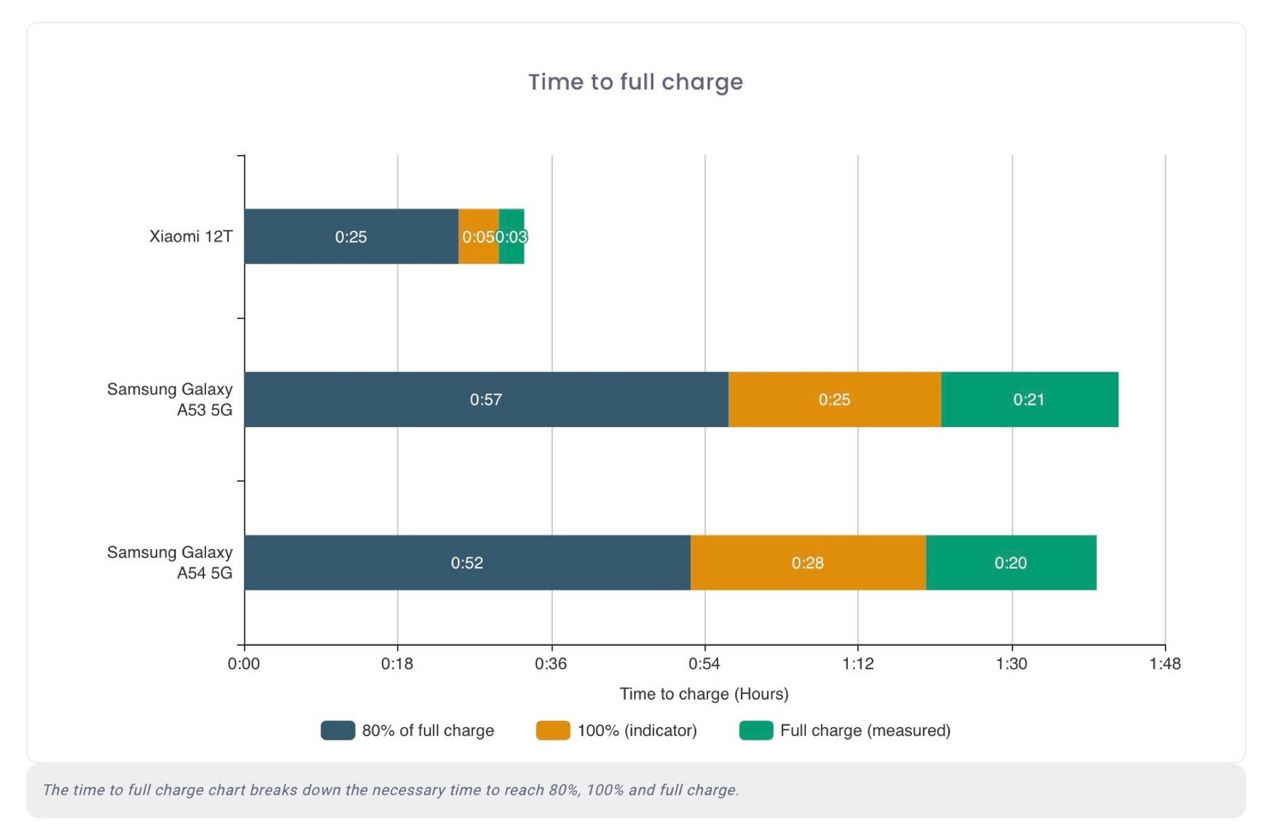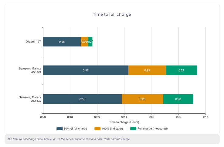 Allen voran zeigt die Akku-Analyse nur mittelmäßige Resultate – trotz 5.000 mAh Akku verbraucht der 5 nm Exynos 1380 in einigen Szenarien vergleichsweise viel Energie. Beim Musik-Streaming macht das Gerät schon nach 26 Stunden schlapp, weitaus schneller als viele Konkurrenten. Eine volle Ladung dauert mit 01:40 Stunden relativ lange, vor allem verglichen mit ähnlich teuren Smartphones aus China, wie dem Xiaomi 12T, das in rund einer halben Stunde voll aufgeladen werden kann.