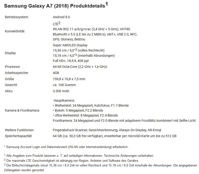 Soeben hat Samsung Deutschland die Preise und Farboptionen für das Galaxy A7 2018 angekündigt. Die technischen Daten sind jetzt ebenfalls auf Deutsch verfügbar. Wir werden diese umgehend in der Bilderstrecke aktualisieren.