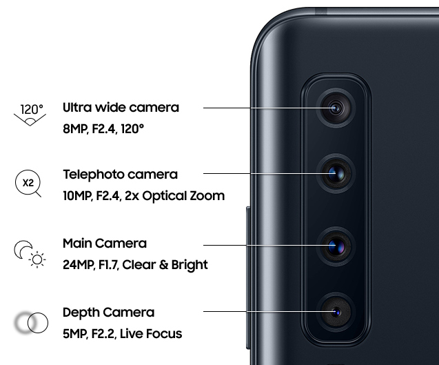 Das Galaxy A9 ist das weltweit erste Smartphone mit einer Quad-Hauptkamera. Samsung verspricht sich von diesem Smartphone-Kamerasystem mit vier Objektiven in Kombination mit einer intelligenten und smarten Bildverarbeitung sowohl eine Steigerung der Bildqualität als auch mehr Optimierungspotenzial für verschiedene Aufnahmesituationen. Die 4-Linsen-Kamera nutzt ein 24-MP-Modul mit Weitwinkel, Autofokus und f/1.7, die 10-MP-Unit als Tele (F2.4) ein 2-faches optisches Zoom mit Autofokus. Zudem stehen ein Ultra-Weitwinkel mit Offenblende f/2.4, 120-Grad-Bildbereich und 8 MP sowie ein 5-MP-Sensor (f/2.2) für Bokeh-Effekte zur Verfügung. Vorne steht für Selfies eine 24-MP-Frontkamera mit f/2.0 zur Verfügung.