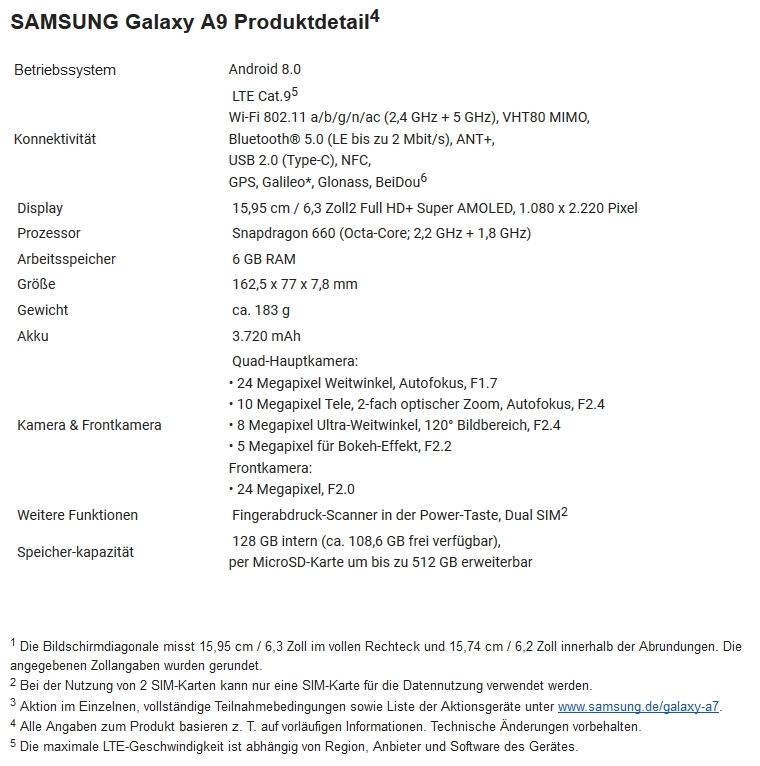 Neben den interessanten Farben für das rund 183 Gramm schwere Galaxy A9 spendiert Samsung seinem Galaxy A9 auch eine Rückseite aus geschwungenem Glas. Das 6,3 Zoll große Super-AMOLED-Display bietet 2.220 x 1.080 Pixel. Angetrieben wird das A9-Modell von einem Qualcomm Snapdragon 660 8-Kern-Chip, den 6 GB RAM und 128 GB interner Speicher zur Seite stehen. Wer mehr Platz für Fotos, Musik oder Videos braucht, der kann über optional erhältliche microSD-Karte bis zu 512 GB zusätzlich nutzen.