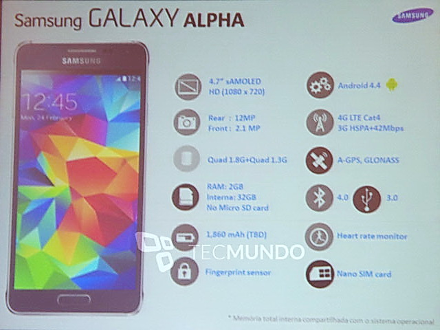 Aus Brasilien kommen die angeblich finalen Spezifikationen zu Samsungs Smartphone Galaxy Alpha: Android 4.4 KitKat, ein 4,7 Zoll großes Super-AMOLED-Display mit 1080 x 720 Pixeln (auf dem Bild), was aber wohl 1280 x 720 Pixel sein sollen, 2 GByte RAM, je nach Modell 32 oder 64 GByte eMMC, zwei Kameras (12 MP hinten, 2,1 MP vorne) und ein 1860-mAh-Akku (TBD). Als Preis werden rund 2400 Reais, umgerechnet 784 Euro genannt.