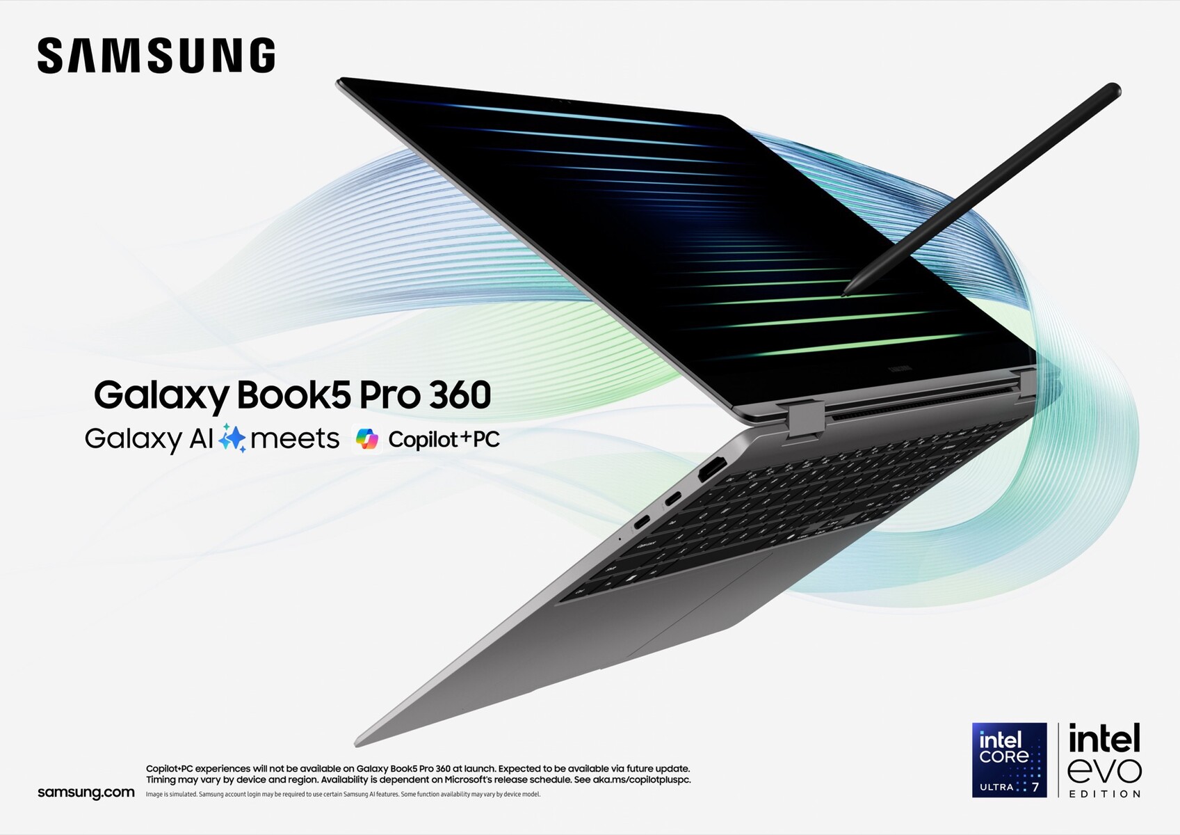 Dazu gibts 16 GB Arbeitsspeicher und eine 512 GB bis 1 TB fassende SSD. Das 12,8 Millimeter dünne, 1,69 Kilogramm leichte Convertible besitzt einen 76 Wh Akku, der in Verbindung mit dem sparsamen Intel-Prozessor eine Akkulaufzeit von bis zu 25 Stunden bei der Wiedergabe von Videos erzielen soll. Das ist durchaus beachtlich, denn Samsung stattet das Galaxy Book5 Pro 360 mit einem 16 Zoll AMOLED-Display im 16:10-Format aus, das eine Auflösung von 2.880 x 1.800 Pixel und eine Bildfrequenz von 120 Hz erreicht.