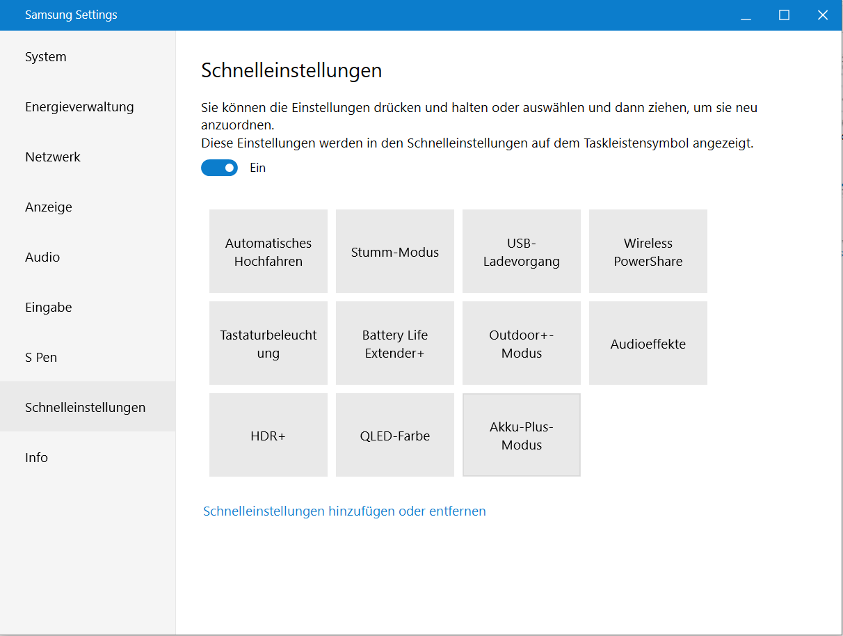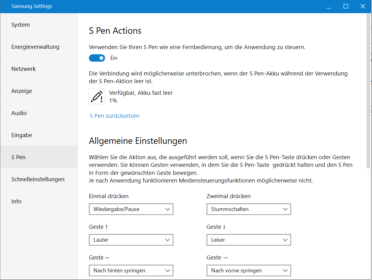 Die vorinstallierte Software "Samsung Settings" hält einen "Stumm-Modus" bereit, der die Geräuschentwicklung deutlich senkt - zu Lasten der Rechenleistung. Stumm bleibt das Convertible aber nicht. Die englischsprachige Version der Software spricht von einem "Silent Mode". "Leise-Modus" wäre die treffendere Übersetzung gewesen. Einige Vergleichsdiagramme dieses Testberichts listen Benchmarkresultate auf, die bei aktivem Stumm-Modus ermittelt wurden.
