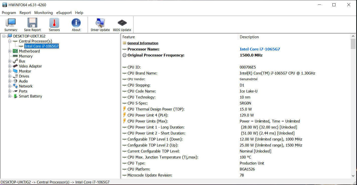 Der Core-i7-1065G7-Vierkernprozessor (Ice Lake) arbeitet mit einer Basisgeschwindigkeit von 1,3 GHz. Mittels Turbo ist eine Steigerung auf 3,4 GHz (alle vier Kerne) bis 3,9 GHz (ein Kern) möglich. Hyperthreading (zwei Threads pro Kern) wird unterstützt.