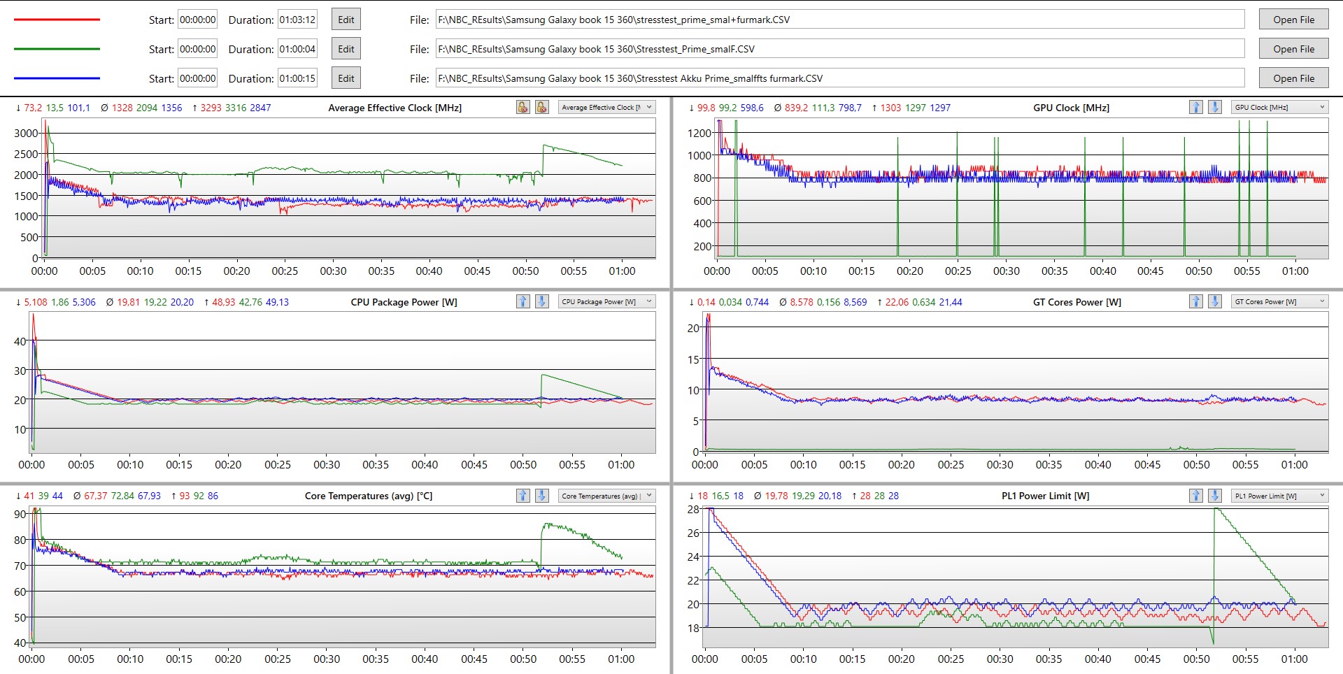 Für einen kurzen Zeitraum kann das Galaxy Book Pro 360 mit 28 Watt Prozessorleistung arbeiten, aber schon nach wenigen Minuten wird das PL1 und die Prozessorleistung immer weiter eingeschränkt. Dauerhaft lag die Leistungsaufnahme des Prozessors eher zwischen 18 und 20 Watt. Aber je nach Kühlsituation kann wohl auch eine höhere oder tiefere Dauerleistung auftreten. So gab es im Stresstest mit Prime95 gegen Ende eine Leistungsspitze, bei der die Ursache nicht klar erkennbar ist.