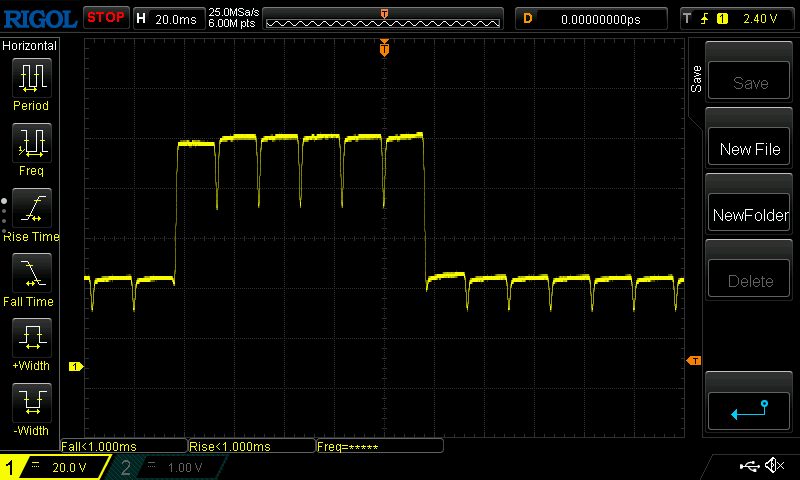 Aber bei der Aktualisierung des angezeigten Bildes wird, wie bei den meisten OLED-Ansteuerverfahren, ein schmaler Bereich des Bildes kurz ausgeschaltet. Je nach eingestellter Helligkeit werden auch mehr oder breitere Streifen dunkel. Unser Messgerät sieht so ein Flackern des Bildes, wie es auch bei einer PWM-Steuerung auftreten kann. Das Flackern des OLED-Bildschirms ist aber etwas augenschonender als eine PWM-gesteuerte Hintergrundbeleuchtung, weil nicht der ganze Bildschirm dabei dunkel wird. An den Messergebnissen zeigt sich, dass ein einzelner Bereich des Bildschirms nur wenige Nanosekunden lang deaktiviert ist, während ein Bild rund 16 Millisekunden lang angezeigt wird.