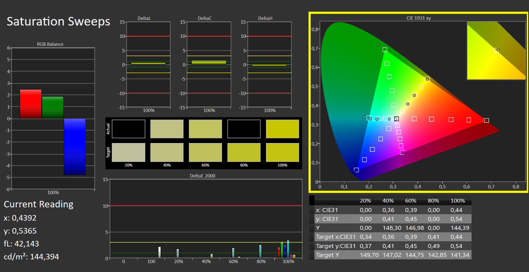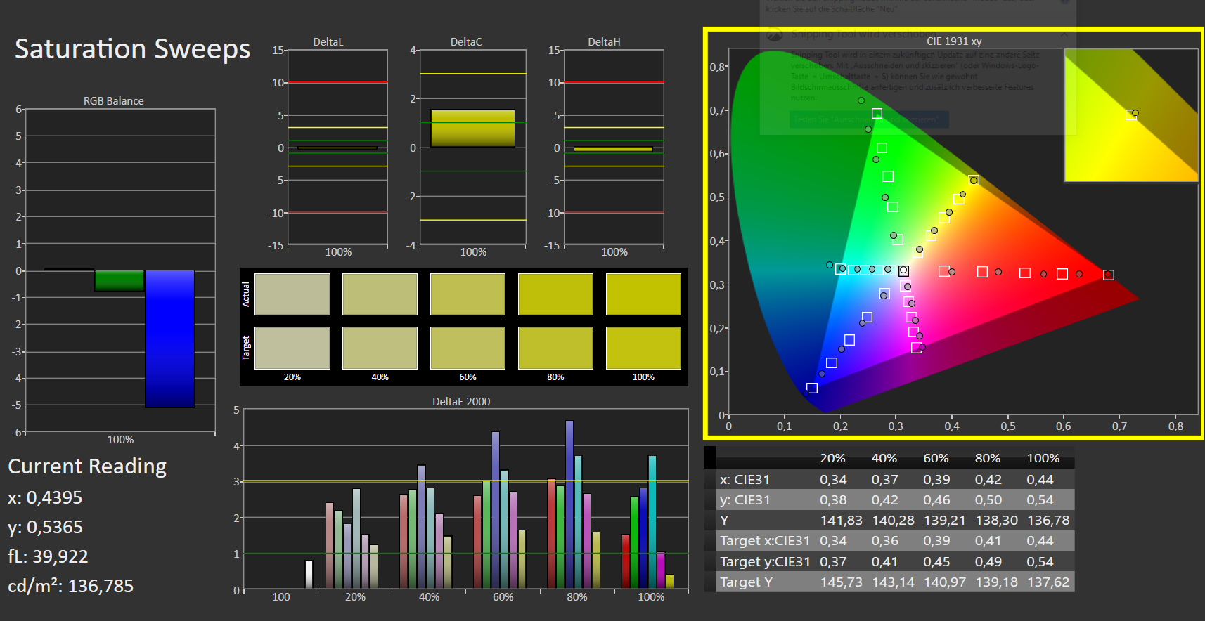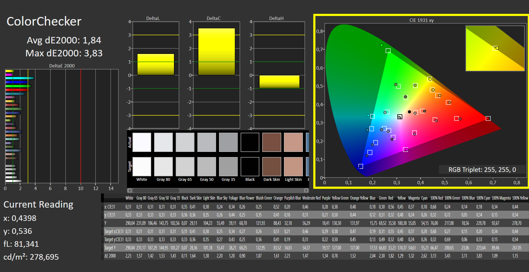 In den Messungen der Farbabweichungen zeigen sich nur bei den Grüntönen leichte Abweichungen. Mit einem gemittelten ΔΕ von 1,84 liegt die Farbwiedergabe auf einem Niveau, bei dem nur sehr geübte Augen Farbabweichungen feststellen können.
