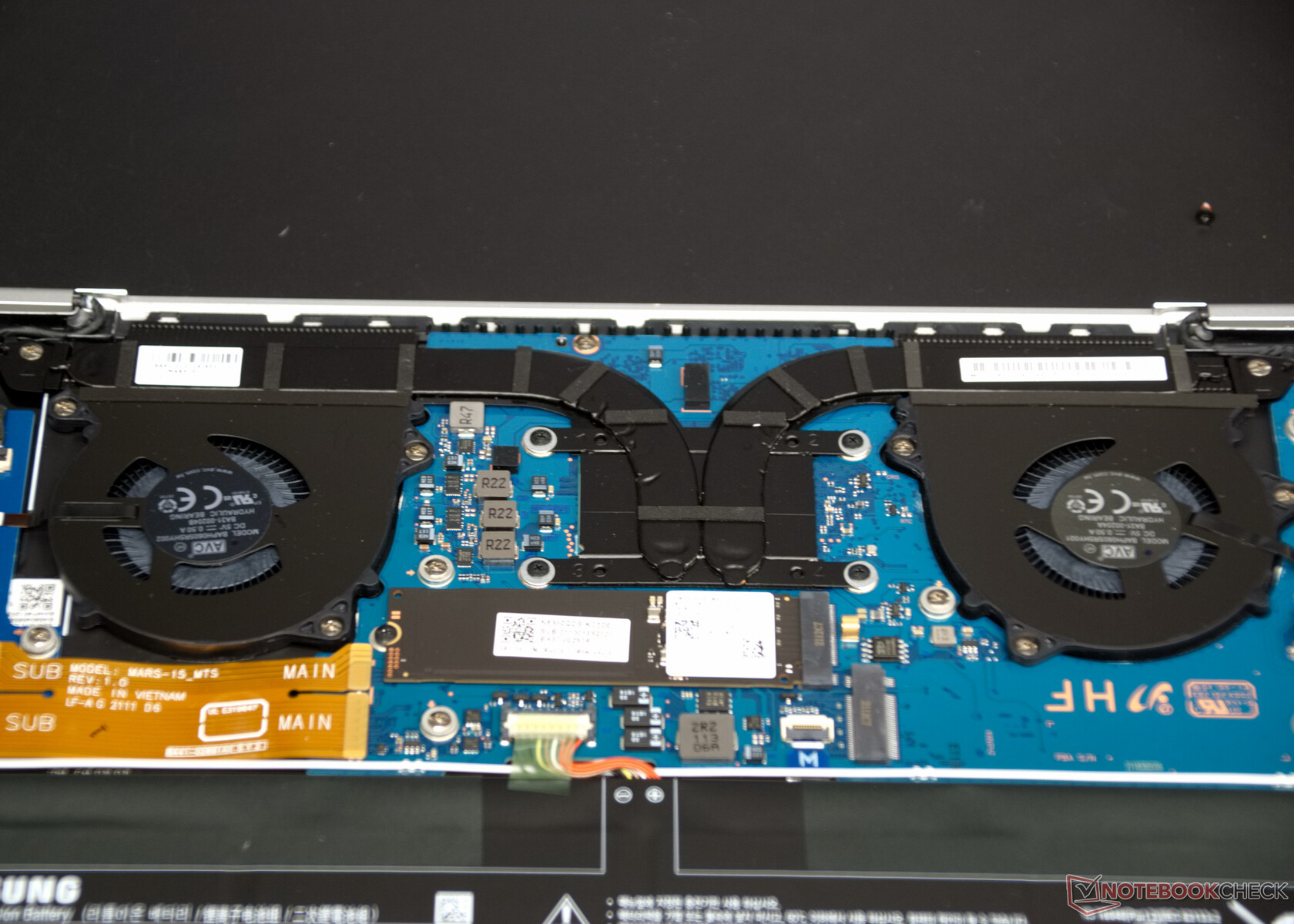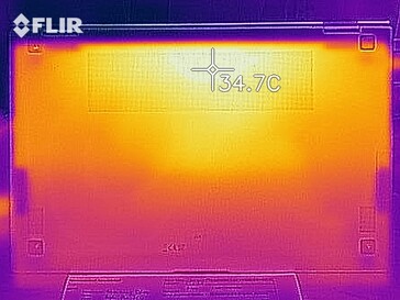 Unangenehm hohe Oberflächentemperaturen stellten sich im Test weder auf der Ober- noch auf der Unterseite ein. Aber die Leistungssteuerung des Notebooks passt zum Teil auch die Leistung an, um die Oberflächentemperaturen auf einem niedrigen Wert zu halten. Wie auch bei anderen Laptops mit Metallgehäuse kann es vorkommen, dass die Leistung des Prozessors eingeschränkt wird, um unangenehm hohe Temperaturen zu vermeiden. In der Samsung Settings App äußert sich dies, indem "Das System passt die Leistung an, um die Benutzersicherheit zu erhöhen." angezeigt wird.