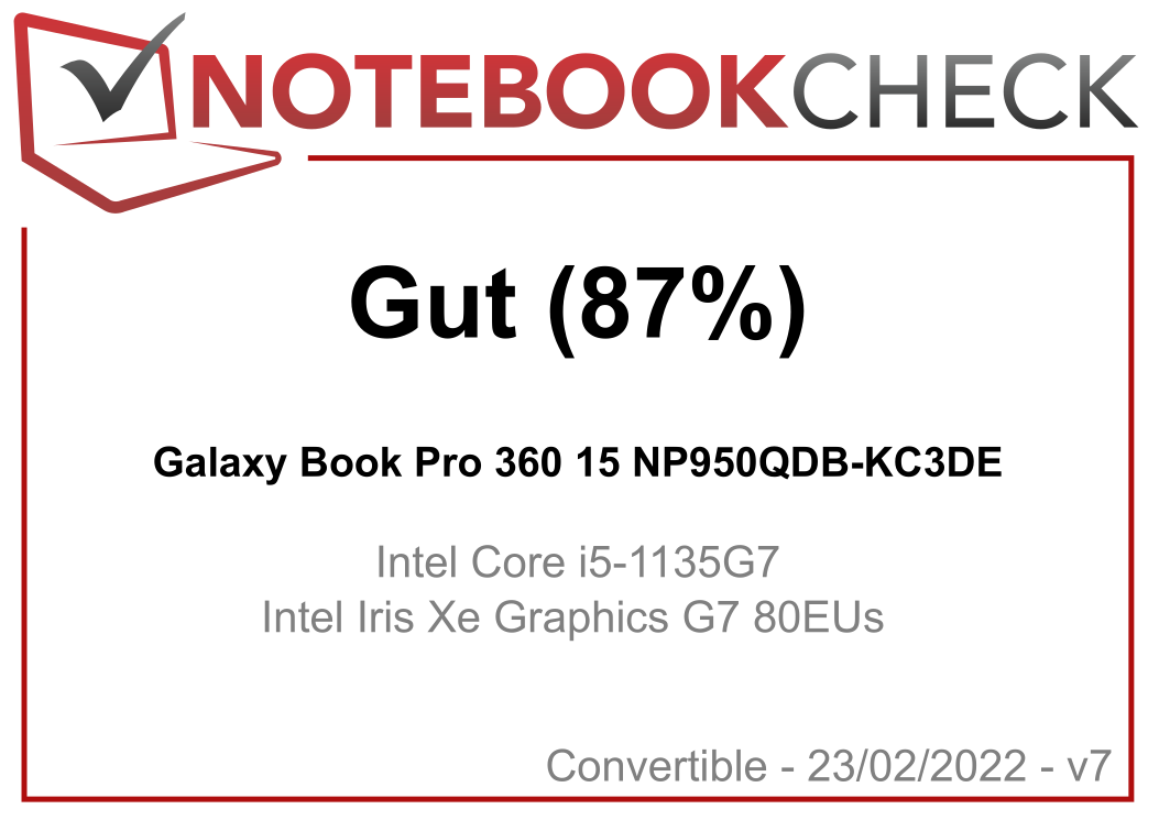 | 86.6 % v7 (old) | 02 / 2022 | Samsung Galaxy Book Pro 360 15 NP950QDB-KC3DE i5-1135G7, Iris Xe G7 80EUs | 1.4 kg | 11 mm | 15.60" | 1920x1080 | |