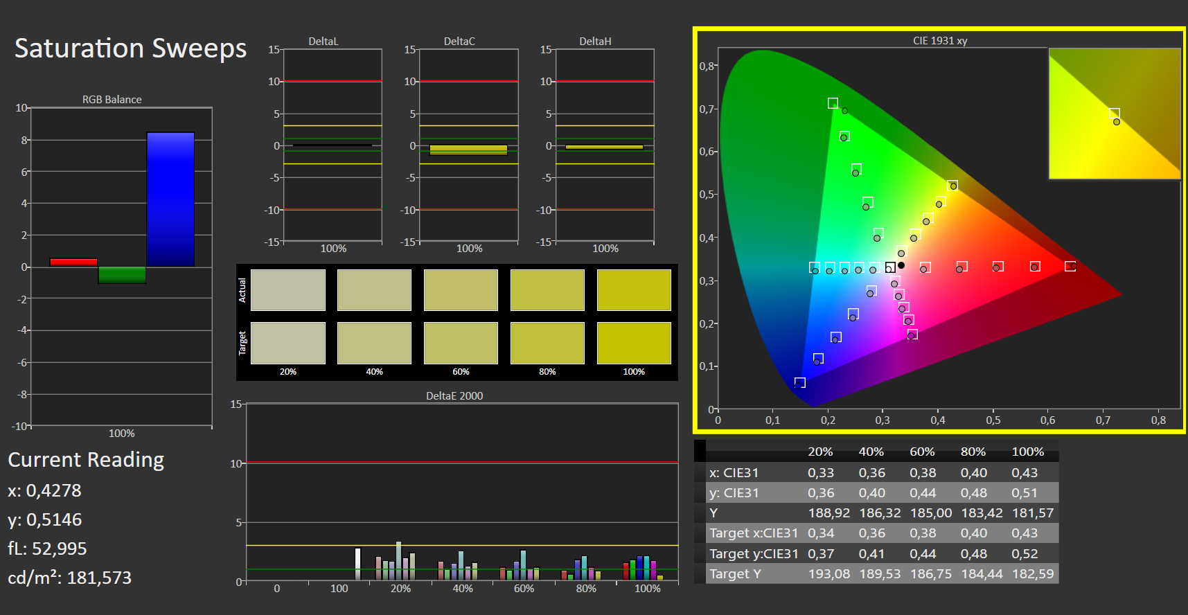 | Delta E Graustufen * | 2.35 | 3.3 -40% | 6.9 -194% | 1.2 49% | 1.24 47% | 2.1 11% |