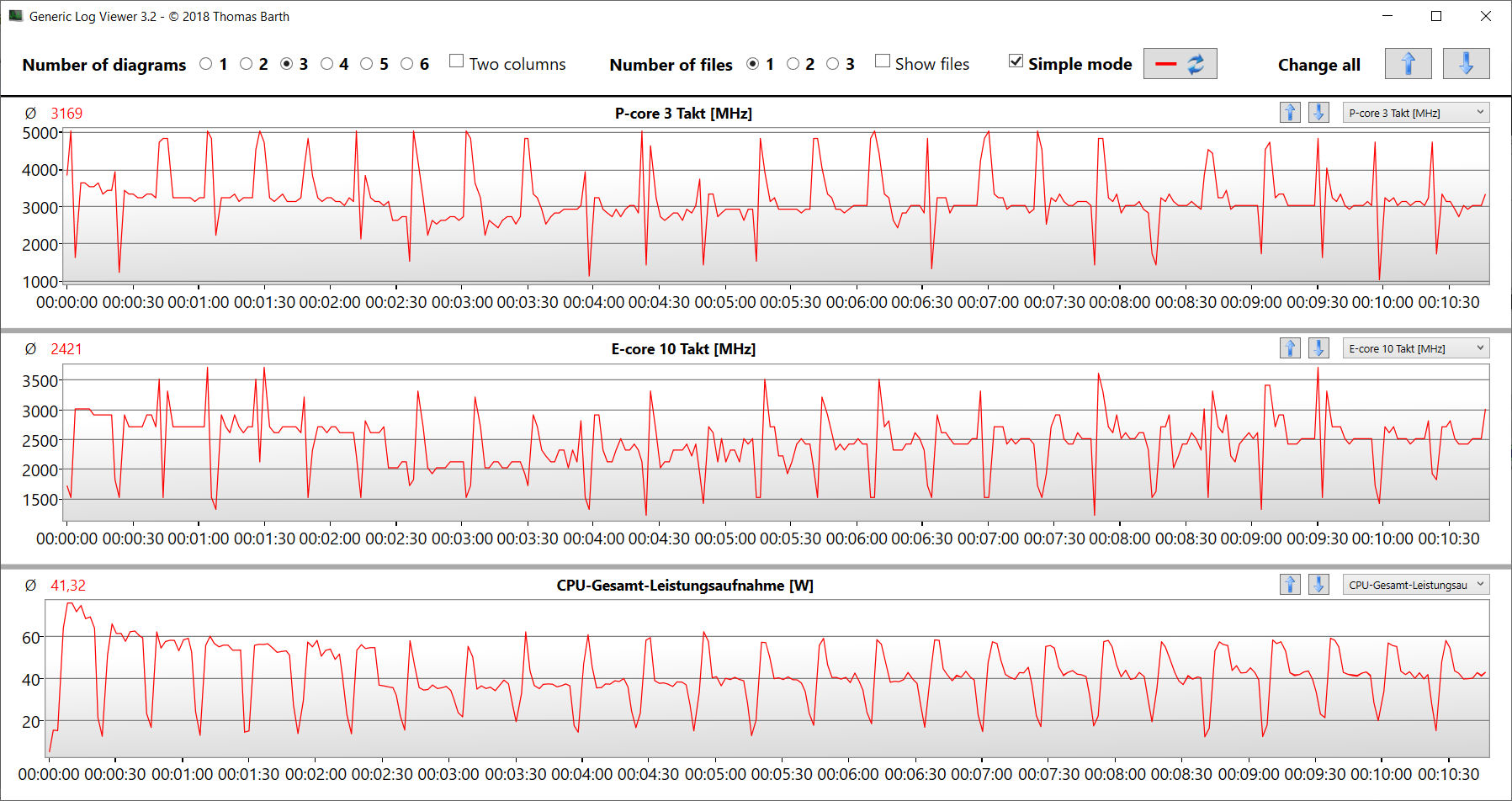 Der Stresstest (Prime95 und Furmark im Dauerbetrieb) stellt ein Extremszenario zur Überprüfung der Systemstabilität unter Volllast dar. CPU (P: 2,8 bis 2,9 GHz, E: 2,3 bis 2,4 GHz) und GPU (ca. 1.100 MHz) beginnen den Test mit Geschwindigkeiten etwa auf Basistaktniveau. Im weiteren Verlauf sinken die Werte deutlich.