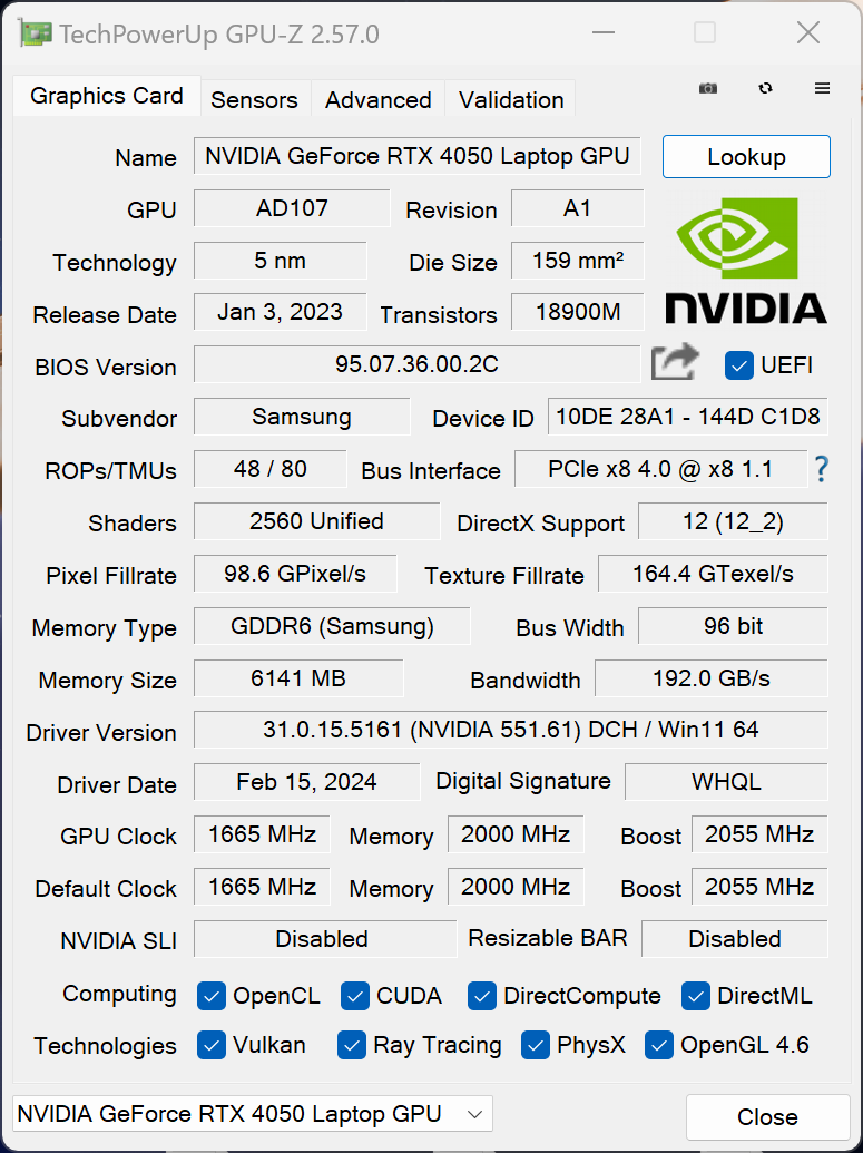 | Samsung Galaxy Book4 Ultra Ultra 7 155H, GeForce RTX 4050 Laptop GPU, Samsung PM9A1 MZVL2512HCJQ, OLED, 2880x1800, 16" | Lenovo ThinkPad Z16 Gen 2 R9 PRO 7940HS, Radeon RX 6550M, Kioxia XG8 KXG8AZNV1T02, OLED, 3840x2400, 16" | Apple MacBook Pro 16 2023 M3 Pro Apple M3 Pro 12-Core, M3 Pro 18-Core GPU, Apple SSD AP0512Z, Mini-LED, 3456x2234, 16.2" | Lenovo Slim Pro 9i 16IRP8 i9-13905H, GeForce RTX 4050 Laptop GPU, Samsung PM9A1 MZVL21T0HCLR, Mini-LED, 3200x2000, 16" | Schenker VISION 16 Pro (M23) i7-13700H, GeForce RTX 4070 Laptop GPU, Samsung 990 Pro 1 TB, IPS, 2560x1600, 16" | Samsung Galaxy Book3 Ultra 16 i7-13700H, GeForce RTX 4050 Laptop GPU, Samsung PM9A1 MZVL2512HCJQ, AMOLED, 2880x1800, 16" | Durchschnittliche NVIDIA GeForce RTX 4050 Laptop GPU | Durchschnitt der Klasse Multimedia | |