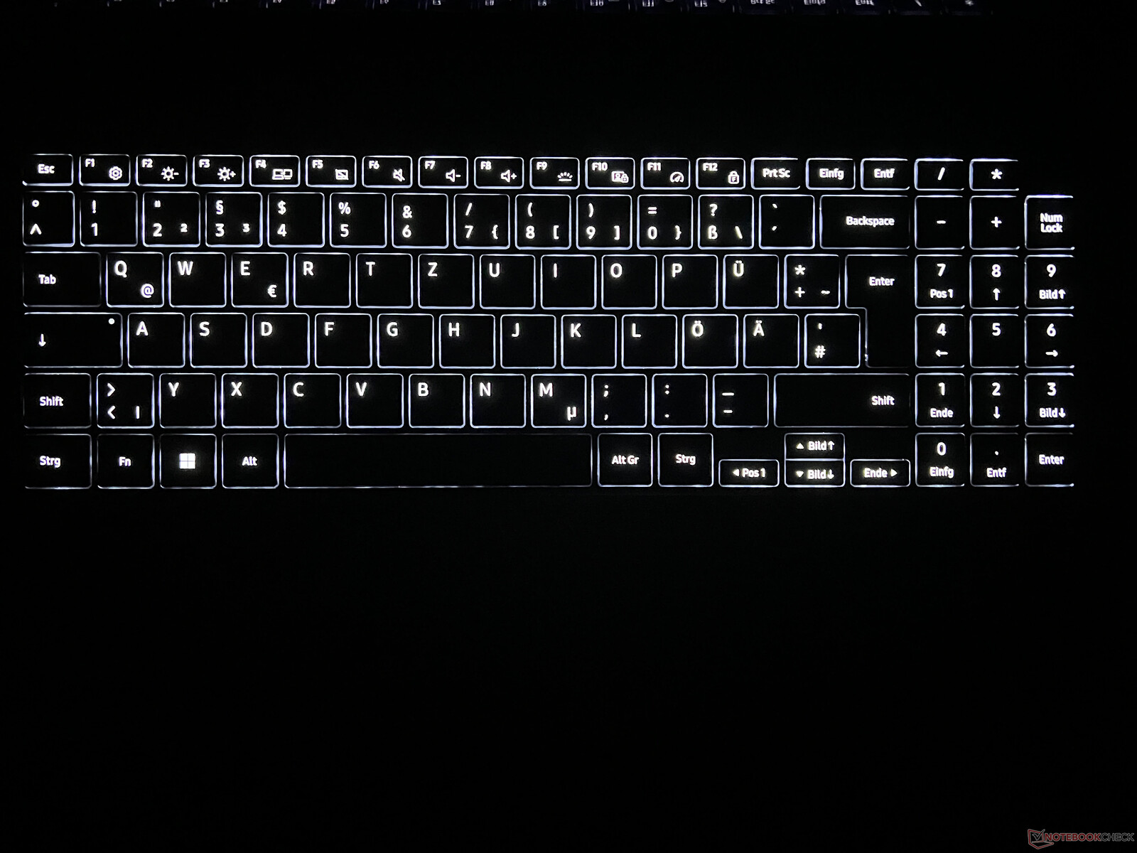 Samsung stattet das Galaxy Book4 Ultra mit einer Tastatur samt Nummernblock aus. Das Tippgefühl leidet etwas unter dem kurzen Tastenhub sowie dem deutlichen Anschlagsgeräuschen und im direkten Vergleich mit dem regulären Galaxy Book4 Pro wirken die Anschläge nicht so präzise. In dieser Disziplin fällt das Samsung-Notebook auch hinter seine Konkurrenten zurück. Wer viel tippt, sollte die Tastatur nach Möglichkeit vorher ausprobieren. Der Power-Button oben rechts dient gleichzeitig als Fingerabdruckscanner. Die weiße Hintergrundbeleuchtung bietet 3 Intensitätsstufen und kann automatisch aktiviert werden.