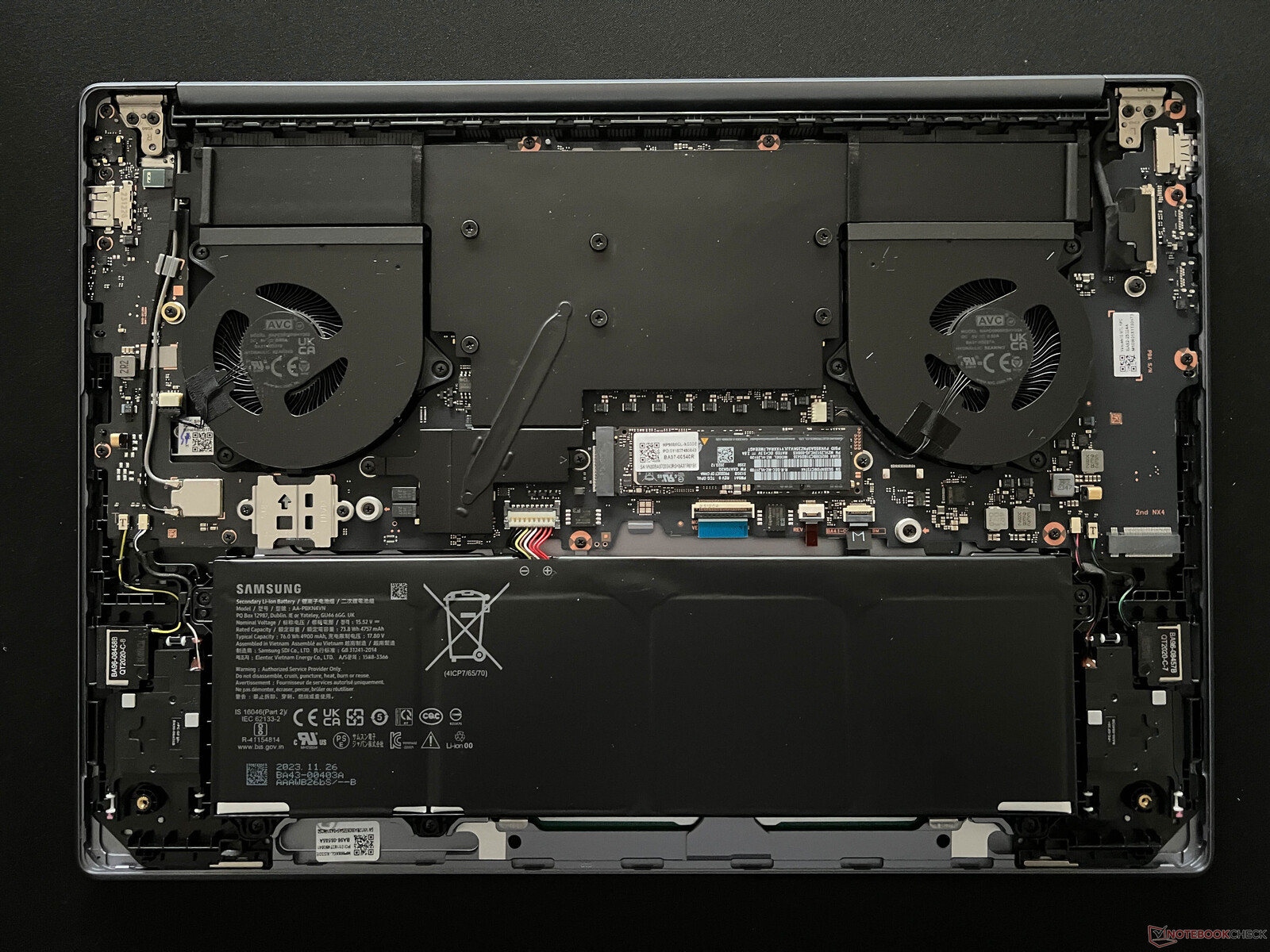Auf der Unterseite gibt es vier versteckte Schrauben unter gesteckten Gummifüßen. Die untere Abdeckung sitzt aber auch ohne Schrauben extrem fest, da es zusätzliche Halteklammern in der Mitte gibt. Im Inneren sieht man dann die beiden Lüfter und die große Vapor-Chamber. Es gibt zwei Steckplätze für M.2-2280-SSDs und der verschraubte Akku kann im Bedarfsfall getauscht werden, alle anderen Komponenten sind verlötet.
