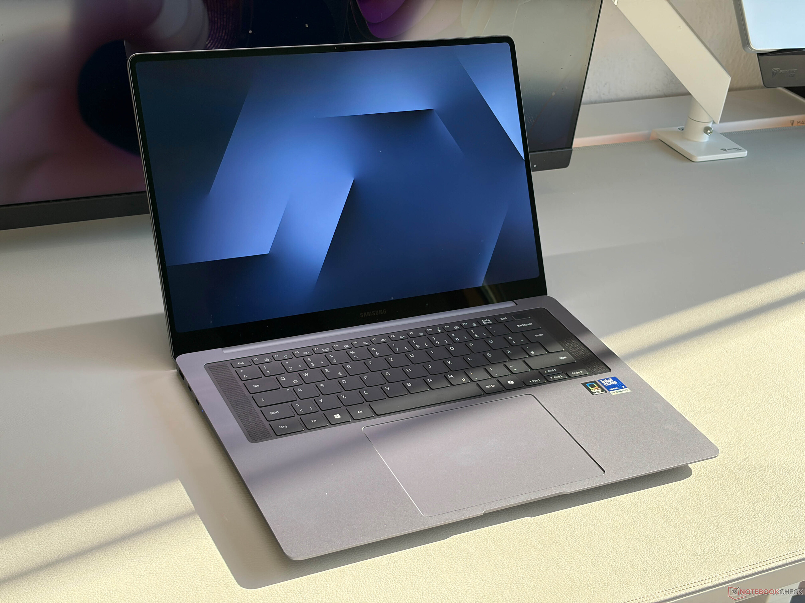 Das Aluminiumgehäuse ist wieder einmal sehr schlank und stabil und die Anschlussausstattung ausreichend, wenngleich ohne card reader. Die Lüfter sind leise, die Temperaturen sind niedrig und die Akkulaufzeiten sind sehr gut, auch wenn einige Konkurrenten mit günstigeren Bildschirmen, wie das Dell XPS 16, das wir getestet haben, mehr Ausdauer haben. Uns gefallen auch die neuen Eingabegeräte mit dem haptischen Trackpad, aber leider hat Samsung den dedizierten Ziffernblock entfernt.