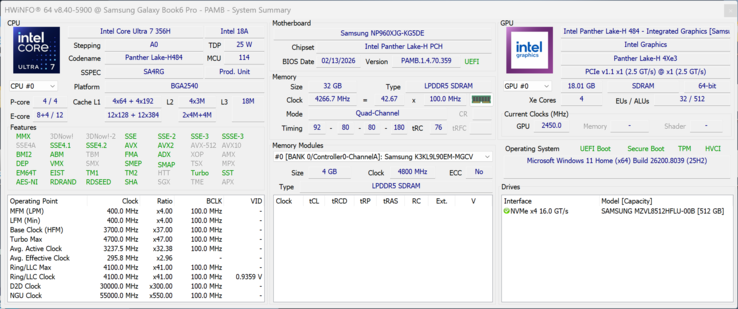 Samsung verwendet den neuen Core Ultra 7 356H (Panther Lake) mit insgesamt 16 Kernen. Die kurzfristige Leistungsgrenze ist mit 80 Watt sehr hoch, sinkt aber schnell auf nur 30 Watt. Das bedeutet, dass die Leistung in kurzen Spitzenlastszenarien gut ist, aber bei anhaltender Arbeitslast um etwa 25 % abfällt. Im Akkubetrieb sinkt die CPU-Leistung nur geringfügig (- 5 %, 60/30 W).