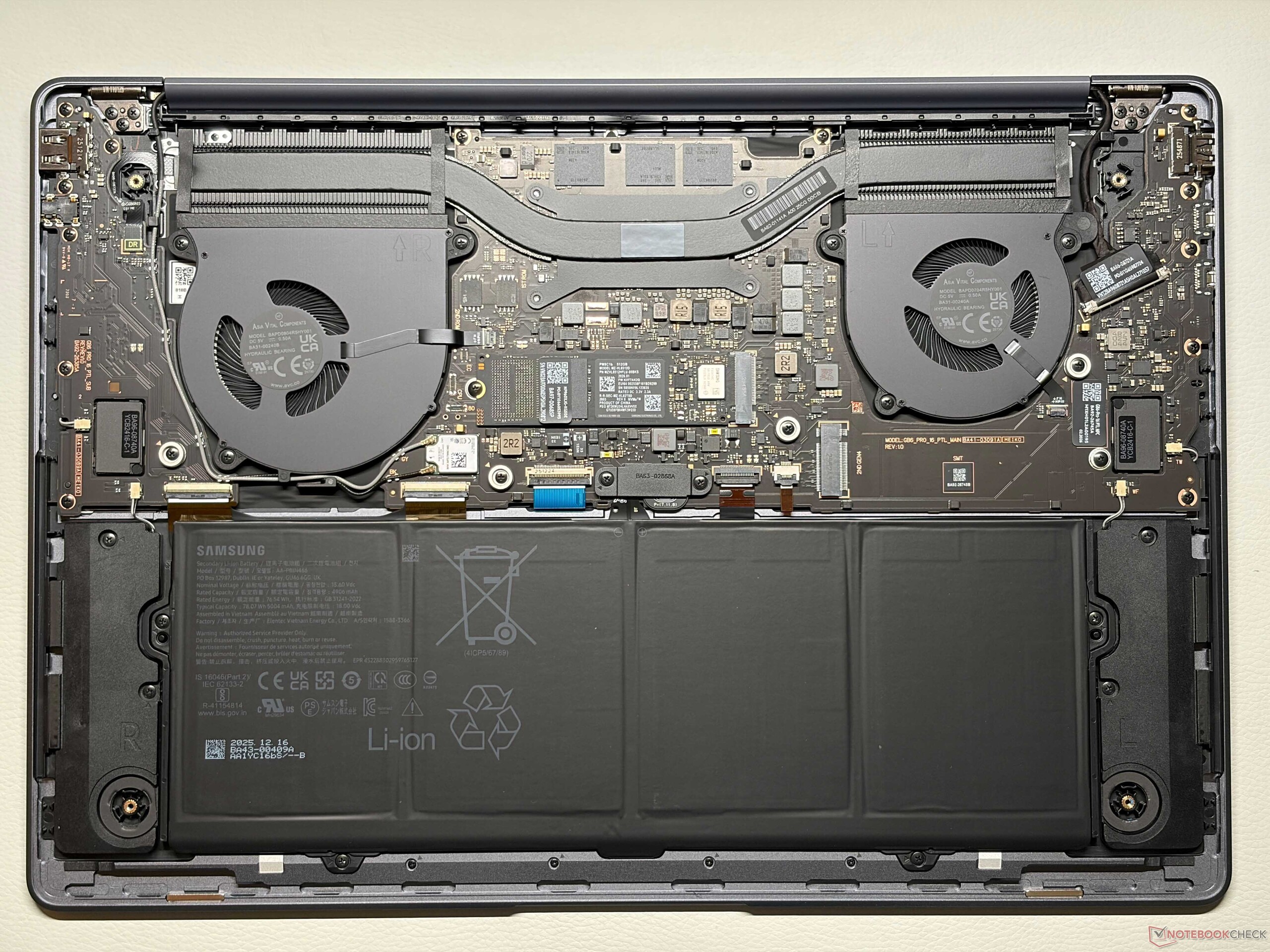 Das Design ist mit dem des Vorgängermodells so gut wie identisch, d.h. Sie erhalten wieder ein schlankes 16-Zoll-Notebook mit einem hochwertigen Aluminiumgehäuse. Die silberne Farbe zieht Fingerabdrücke nicht wirklich an und die Stabilität ist ausgezeichnet. Insbesondere der untere Bildschirmrand ist wieder sehr dick. Das neue Tastaturdesign sowie das neu angeordnete Samsung-Logo auf dem Deckel sind im Grunde die einzigen beiden sichtbaren Änderungen. Das interne Layout wurde ebenfalls leicht verändert, aber Sie erhalten weiterhin zwei M.2-2280 SSD-Steckplätze, alle anderen Komponenten sind onboard.