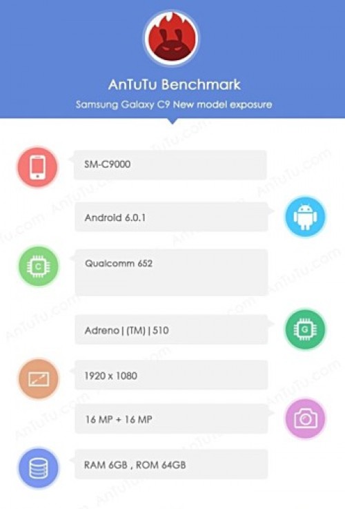 Steve Hemmerstoffer entdeckte ein neues Samsung Phone in den unendlichen Listings der chinesischen Regulierungsbehörde TENAA. Beim Samsung Galaxy C9 handelt es sich um eine größere Variante der bereits bekannten Galaxy C-Serie von denen es bisher das Galaxy C5 und das Galaxy C7 gibt. Abgesehen vom TENAA-Listing haben wir auch einen AnTuTu-Screenshot vom Gerät, sodass wir neben den Bildern auch in Bezug auf die technischen Daten einiges zum Galaxy C9 sagen können. Das Gerät mit der Modellnummer SM-C9000 ist ein 6-Zoll-Phablet mit Super AMOLED-Display in Full-HD-Auflösung. Interessanterweise sind die Antennenlinien in ähnlicher Weise ausgeführt wie Oppo das für das R9s teasert.