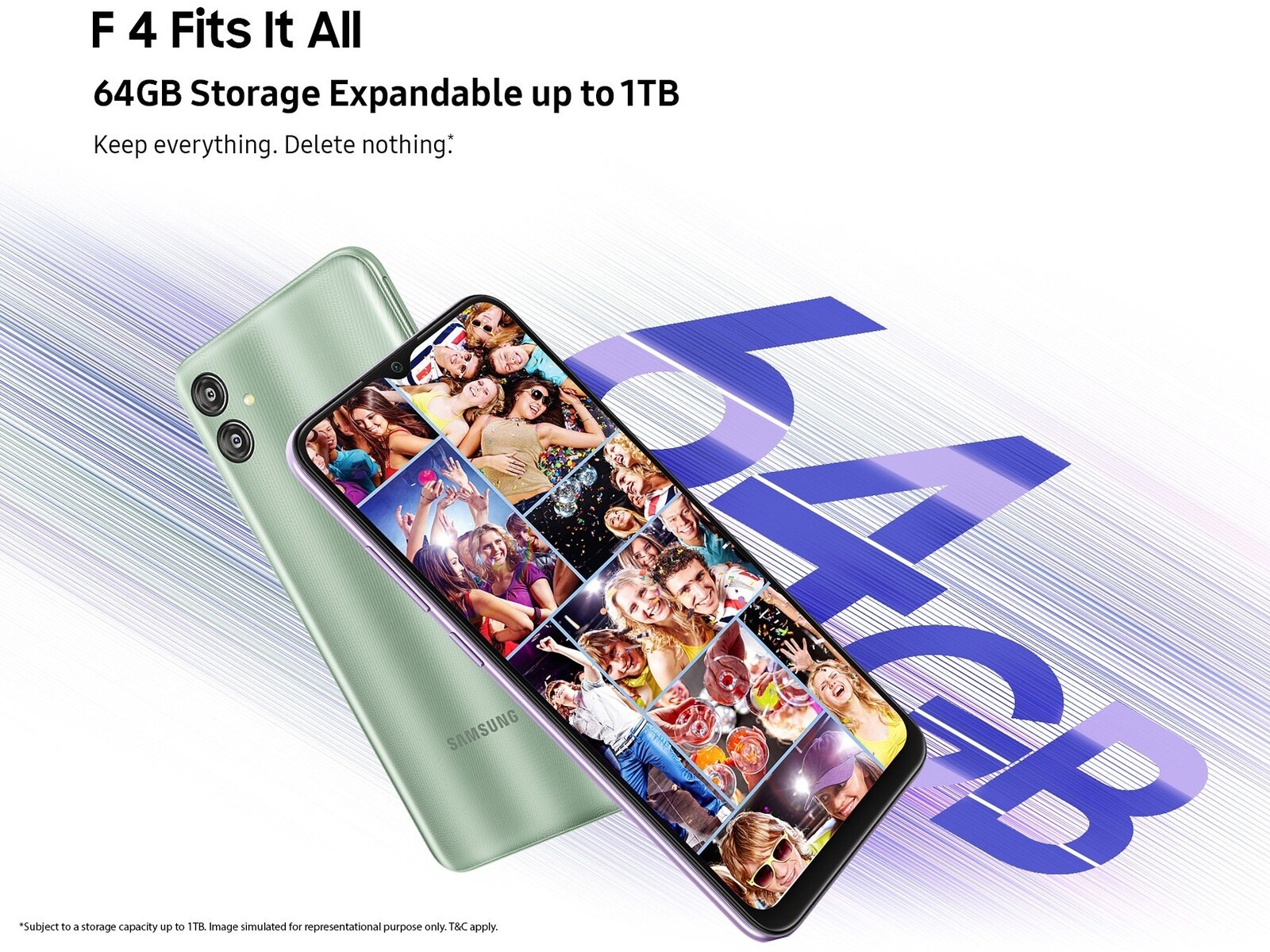 Als Memory bietet das Samsung Galaxy F04 neben 4 GByte Arbeitsspeicher, einen internen Systemspeicher mit 64 GByte. Zusätzlich lassen sich für das Galaxy F04 bis zu 4 GByte als virtueller RAM-Plus-Speicher mappen. Der interne Speicher des Galaxy F04 kann bei Bedarf via optional erhältlicher microSD-Karten auf bis zu 1 TByte erweitert werden.