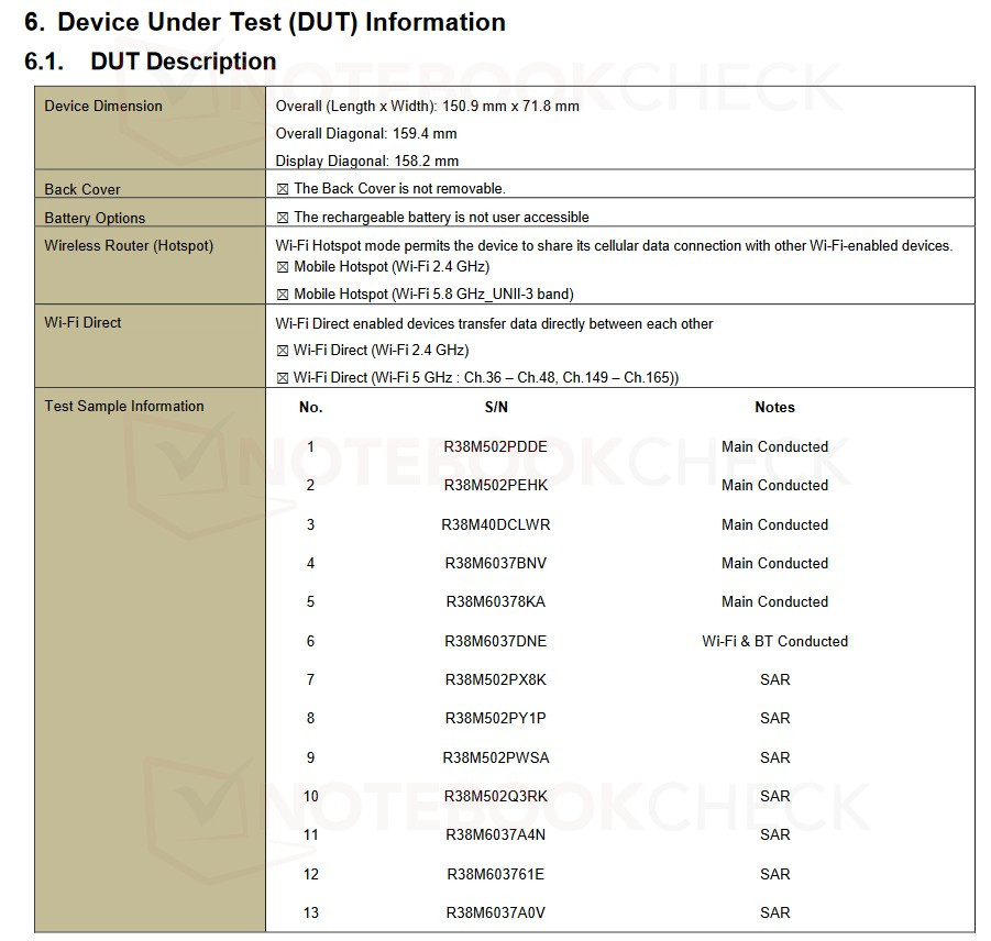 Der FCC-Bericht nennt für das Samsung Galaxy Note 10 (SM-N970F) Abmessungen von 150,9 x 71,8 Millimetern (Länge x Breite) sowie eine Diagonale des Chassis von 159,4 Millimetern. Die Displaydiagonale wird mit 158,2 Millimetern beziffert, was aufgerundet etwa 6,23 Zoll entspricht. Bislang wurden in der Gerüchteküche für das Basismodell 6,3 Zoll angesetzt.
