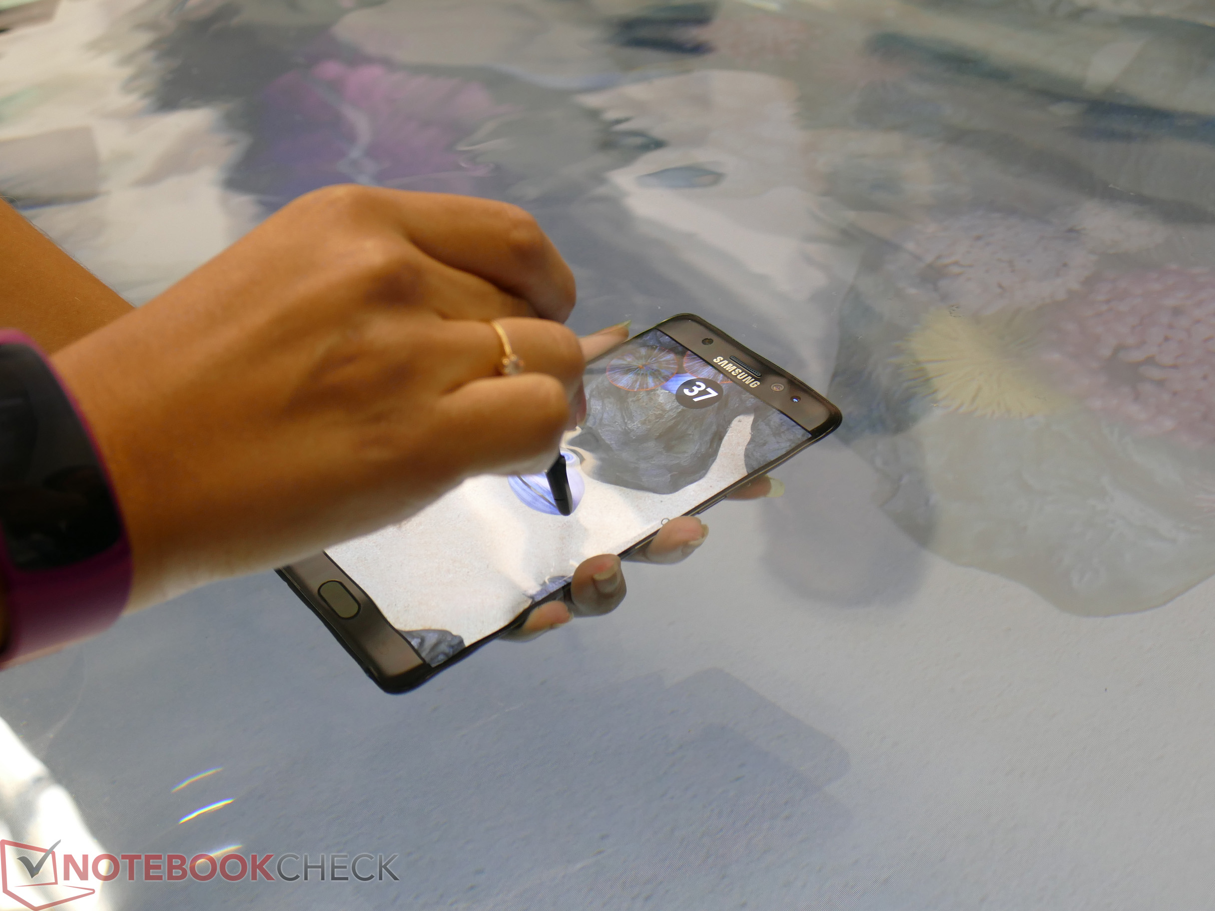 Bei der Displaygröße gibt es keine Veränderungen zum in Deutschland nicht verfügbaren Vorgängermodell Note 5. Mit einer Diagonale von 5,7 Zoll (14,39 cm) ordnet sich das Galaxy Note 7 am oberen Rand der für Flagship-Phones üblichen Displaygrößen ein (Vergleiche auch unsere Top 10 Phablets). Einen Tick größer ist etwa das Huawei Mate 8 (6-inch), sowie einige Smartphone-Exoten. Die Auflösung beträgt 2.560 x 1.440 Pixel, also QHD. Als Besonderheit nutzt das Note 7 erstmals ein Display aus Corning Gorilla Glass 5 (auch an der Gehäuserückseite), welches das Gerät noch widerstandsfähger gegen Kratzer und Displaybruch machen soll. Die eingesetzte AMOLED-Displaytechnologie sorgt wie bei den vergleichbar ausgestatteten Phones der Galaxy-Reihe für extrem hohen Bildkontrast und ermöglich zudem die energiesparende Always-On-Funktion des Displays. So können am gesperrten Bildschirm etwa dauerhaft Informationen zu Uhrzeit und Datum eingeblendet werden, ohne den Energieverbrauch eklatant in die Höhe zu treiben, da nicht benötigte Pixel (schwarz) einfach nicht beleuchtet werden. Ähnlich dem Galaxy S7 Edge (hier im Test), bekommt auch die neuste Ausgabe des Note ein auf beiden Seiten abgerundetes Display "dual edge", dessen Bereiche für Sonderfunktionen genutzt werden können.
