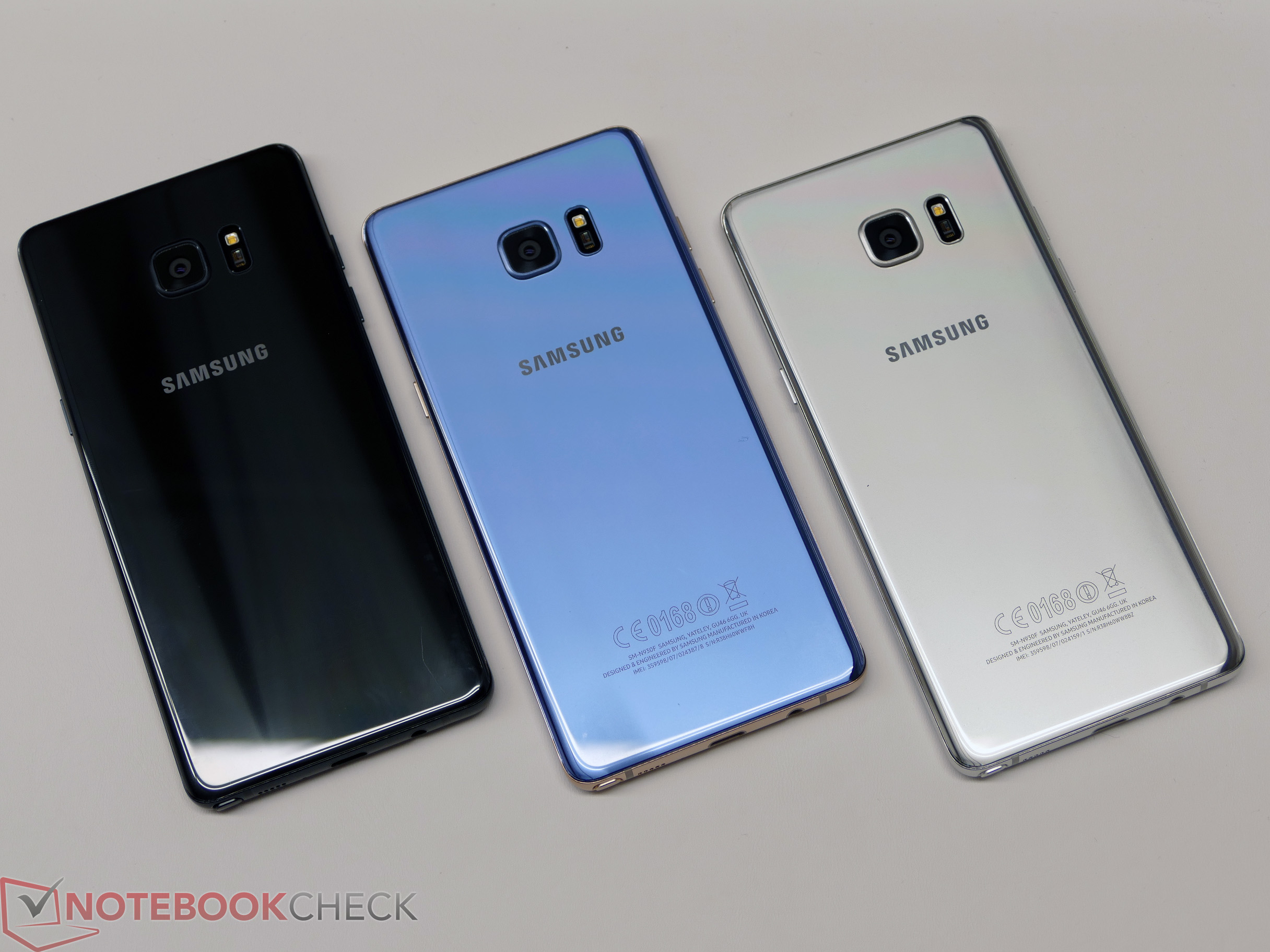 Mit Abmessungen von 153,5 x 73,9 x 7,9 Millimeter ist das neue Note 7 etwas schmäler als sein Vorgänger, das Note 5, und zugleich um wenige Millimeter größer als das Galaxy S7 Edge. Im Vergleich zum 6 Zoll großen Huawei Mate 8 spart das Note 7 rund 7 mm in der Breite und 4 mm in der Länge, während die Dicke mit knapp 8 mm ident ausfällt. Auch Apples iPhone 6S Plus fällt spürbar breiter und länger aus, obwohl es mit einem an sich kleineren 5,5-Zoll-Bildschirm ausgestattet ist. Beim Gewicht platziert sich das Note 7 mit 168 Gramm im Mittelfeld der angeführten Geräte: Apples iPhone 6S Plus sowie das größere Mate 8 sind 17 bis 24 Gramm schwerer, das Galaxy S7 und S7 Edge in etwa gleich viel leichter als das Note 7.