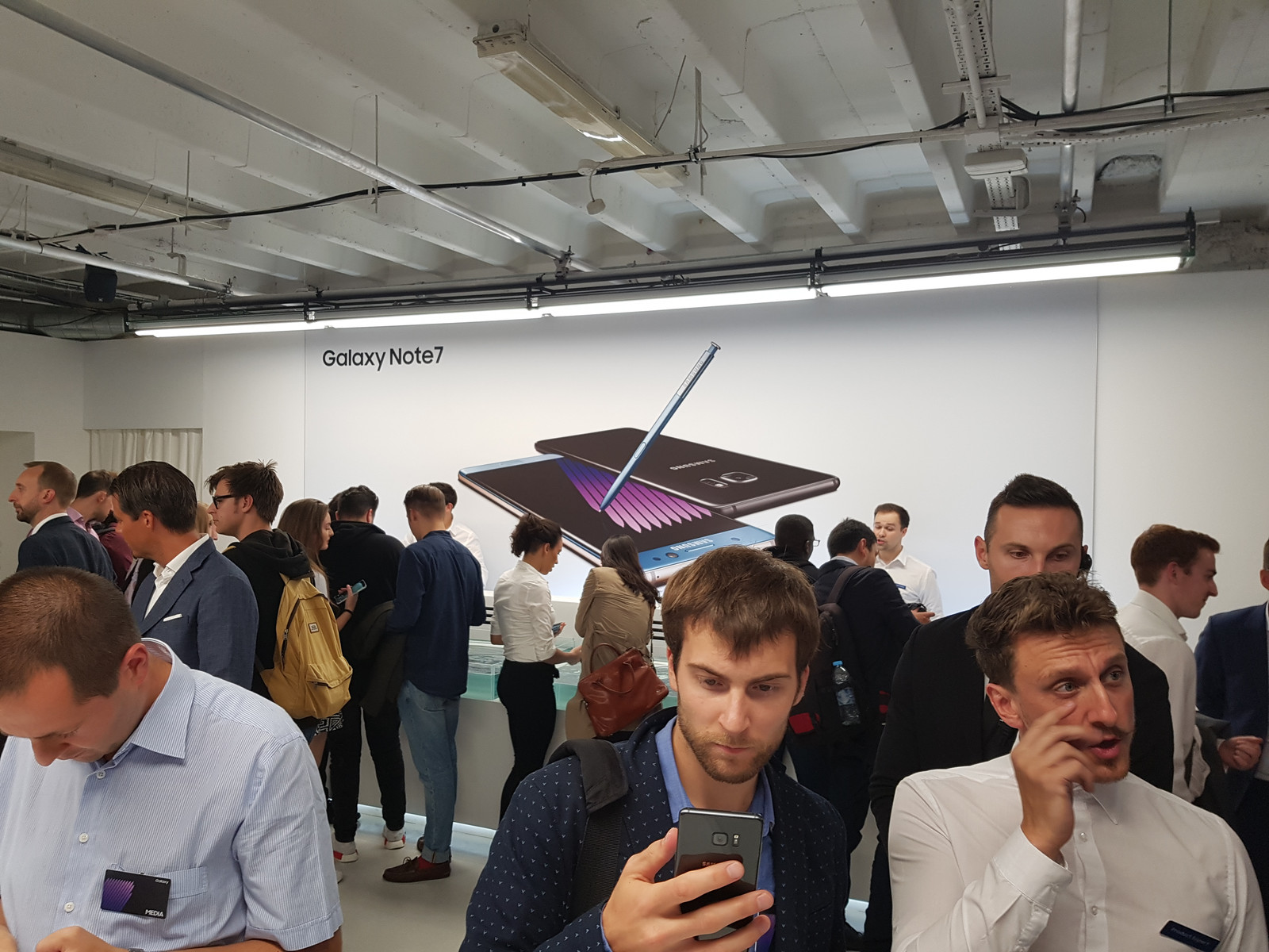 Folgend drei erste schnelle Testbilder von der Veranstaltung vor Ort, aufgenommen mit dem Galaxy Note 7. Wie bereits vom Galaxy S7 bekannt, zeichnet sich das eingesetzte Kameramodul durch einen schnellen Autofokus aus, der ein besonders rasches Auslösen ermöglicht. Auch die Bildqualität bei schummrigen Lichtverhältnissen ist vergleichsweise gut: