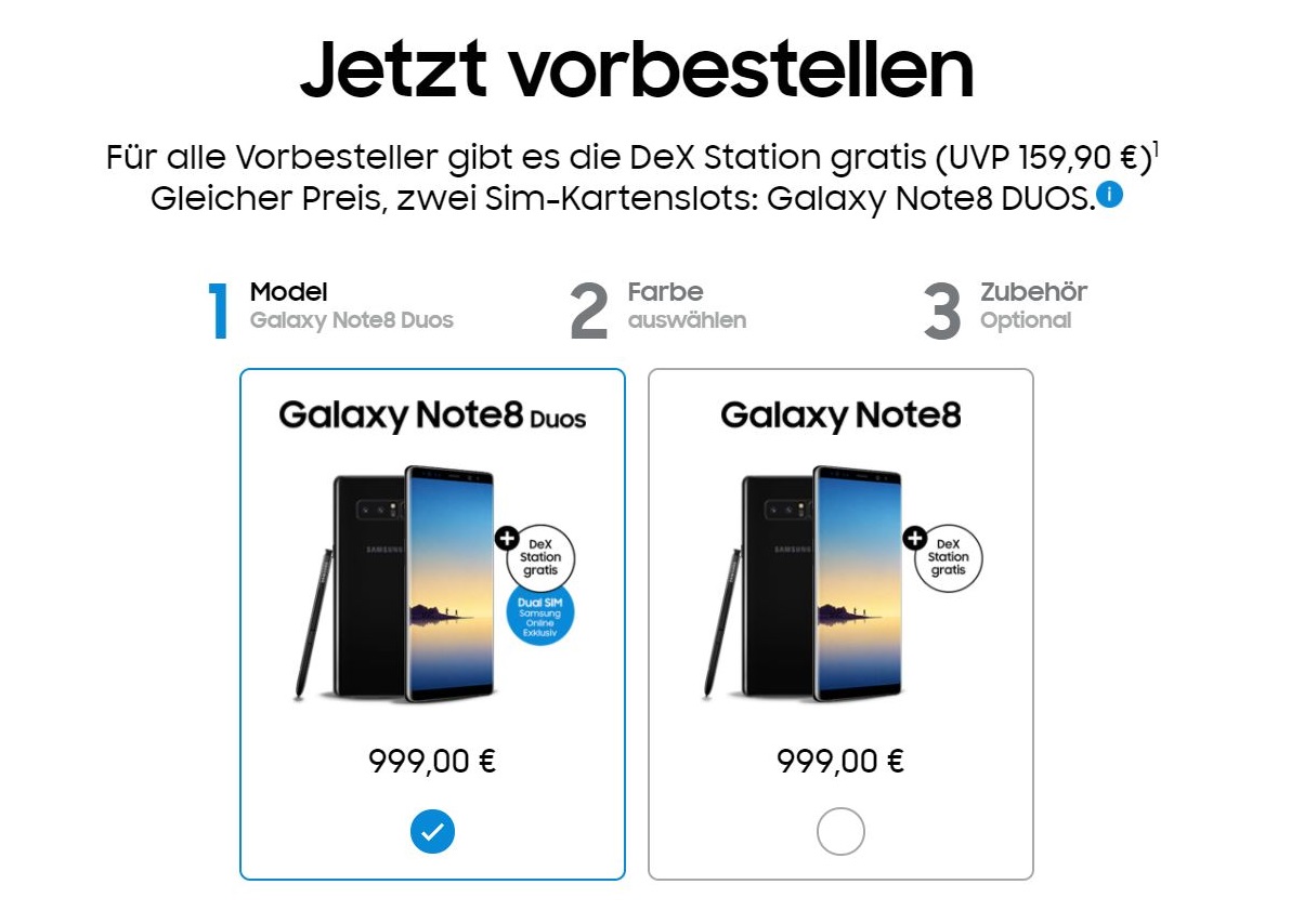 Das nach IP68-Standard wasser- und staubdichte Gehäuse gibt es prinzipiell in den Farben Schwarz, Gold, Blau und Orchideen-Grau, hierzulande sind allerdings vorerst nur die schwarze und goldene Varianten vorbestellbar. Im Samsung-Onlineshop ist das Galaxy Note 8 entweder als Duos-Variante mit 2 SIM-Kartenslots oder als Single-Sim-Version mit Android 7 ab sofort um jeweils 999 Euro zu haben. Wer bis zum 14. September vorbestellt, erhält nachträglich ein DeX-Dock im Wert von 160 Euro zur Verfügung gestellt, das aus dem Galaxy Note 8 in Verbindung mit Monitor und Maus einen ausgewachsenen PC machen soll. Eine DeX-Demo gab es übrigens auch in der heutigen Präsentation. (siehe Bilderstrecke oben). Jede Menge weiteres Zubehör kann im Online-Shop gleich mitbestellt werden. Ab dem 15. September wird das Galaxy Note 8 ausgeliefert.