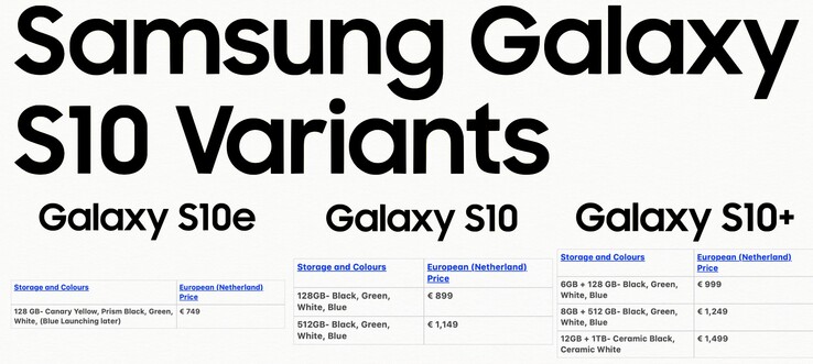 Wie wir dem Bild unten entnehmen können, wird Samsung mindestens 749 Euro für das Galaxy S10 verlangen, damit erkauft man sich das Galaxy S10e, also das "Lite-Modell" mit vermutlich flachem 5,8 Zoll Display und Fingerabdrucksensor an der Seite. Hier gibt es genau eine Version mit 128 GB Speicher in den Farben Canary Yellow (exklusiv), Prism Black sowie Grün und Weiß - eine blaue Variante ist für die Zukunft ebenfalls geplant.