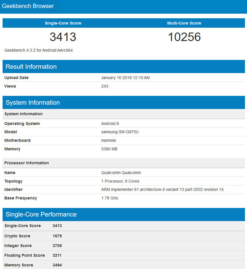 Jüngst machten weitere Informationen aus Südkorea die Runde, welche das Galaxy S10 X als spezielle 5G-Variante der Galaxy-S10-Familie behandelten. Laut einem Bericht soll es sich bei diesem im Geekbench gelisteten Samsung Galaxy S10 Plus SM-G975U nicht um eine weitere 5G-Variante, sondern lediglich um ein "Factory Unlocked"-Modell mit 6 GB Arbeitsspeicher und X24-LTE-Modem handeln, das in den USA verkauft wird. Das Galaxy S10 Plus erzielte einen Single-Core-Score von 3.413 Punkten und einen Multi-Core-Score von 10.256 im Geekbench.