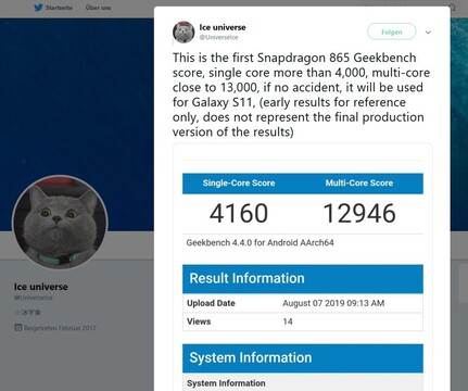 Der Qualcomm Snapdragon 865 SoC dürfte in verschiedenen Premium-Smartphones wie dem Samsung Galaxy S11, Galaxy Note 11, OnePlus 8 und anderen Flaggschiff-Handys von Oppo, Realme, Redmi und Vivo zum Einsatz kommen. Für @UniverseIce ist der 865er jedenfalls bereits ein heißer Kandidat für Samsungs Galaxy S11 als Chipsatz.
