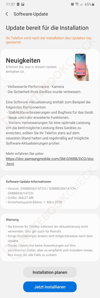 Hier sind genauere und ausführlichere Tests für Foto und Video notwendig. Da das rund 368 MB schwere Firmware-Update aber bereits via OTA ausgerollt wird, dürften in Kürze schon viele Besitzer eines Galaxy S20, Galaxy S20+ und Galaxy S20 Ultra die neueste Version der Kamera-Software ausprobieren und über ihre Erfahrungen - positiv oder negativ - berichten. Die neue Firmware funktioniert für die in Deutschland erhältlichen Exynos-Modelle der Galaxy S20-Reihe.