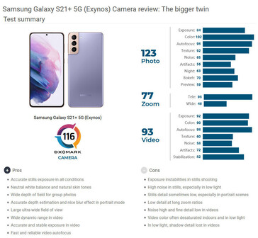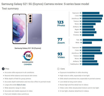Bei beiden Samsung Galaxy S21-Phones bemängelten die Kamera-Tester von Dxomark Belichtungsschwankungen bei Fotoaufnahmen, ein teilweise starkes Bildrauschen, das sich besonders bei schlechten Lichtverhältnissen störend bemerkbar macht, sowie einer geringen Detailgenauigkeit bei Fotos (Porträtszenen) und im langen Zoom-Bereich. Auch bei Videoaufnahmen störte die Tester von Dxomark ein starkes Rauschen und eine geringe Detailgenauigkeit. Positiv bewerte Dxomark unter anderem die präzise Belichtung von Fotos bei allen Bedingungen, den neutralen Weißabgleich und die natürlichen Hauttöne sowie die schönen Unschärfe-Effekte im Porträtmodus.