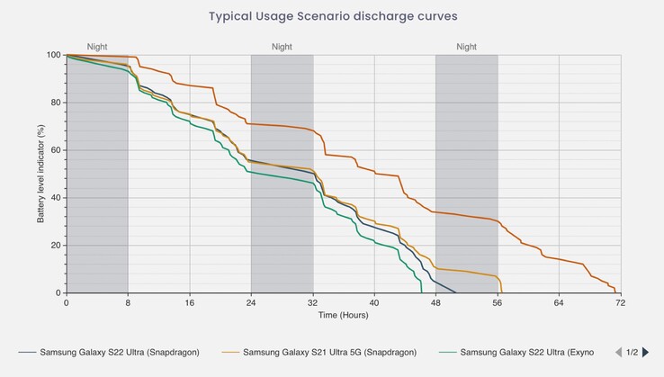 Den 5.000 mAh Akku vollständig aufzuladen dauert per USB-C-Kabel 01:24 Stunden, drahtlos dagegen 02:34 Stunden – hier gibt es kaum Unterschiede zwischen den beiden Varianten des Galaxy S22 Ultra. Alles in allem halten sich die Unterschiede bei der Laufzeit der beiden Versionen von Samsungs jüngstem Flaggschiff in Grenzen.