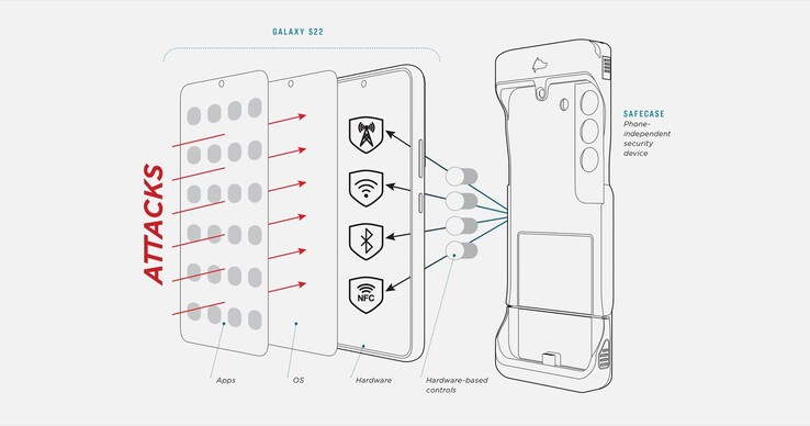 Durch die Kombination zweier Systeme soll es für Schadsoftware wie Spyware in Apps oder Webseiten unmöglich sein, die Privatsphäre-Einstellungen zu umgehen. Das SafeCase erlaubt es, unterschiedliche Hardware-Features unabhängig voneinander zu deaktivieren. Dazu gehören vor allem die Kameras und Mikrofone des Galaxy S22, aber auch alle drahtlosen Verbindungen, inklusive Mobilfunk, Bluetooth, WLAN und NFC.