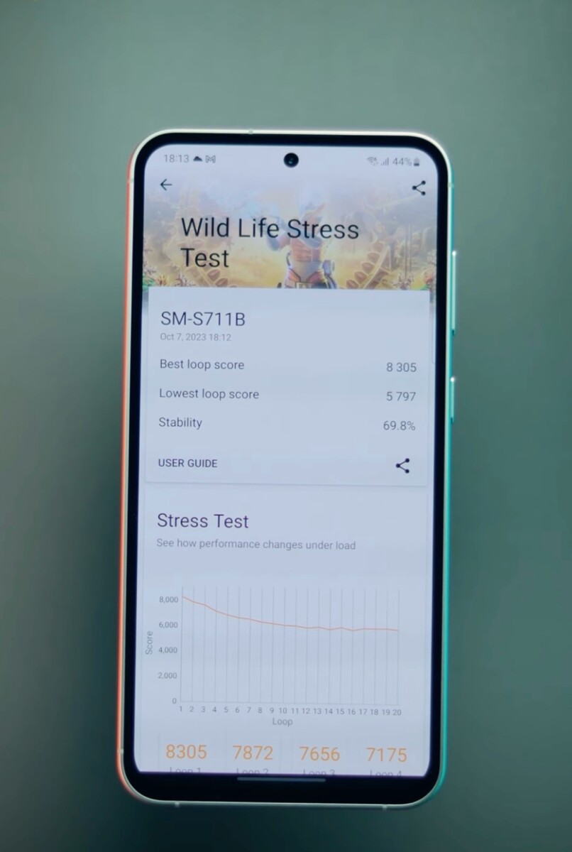In AnTuTu v10 ist das Galaxy S23 FE mit rund 1,19 Millionen Punkten sogar etwas schneller als das Google Pixel 8 Pro. Besonders spannend ist der 3DMark Wild Life Stress Test, der den Grafikchip des Smartphones unter Dauerlast setzt, um zu zeigen, wie stark die Performance des Chips beispielsweise beim Gaming gedrosselt werden muss, um die Temperatur in den Griff zu bekommen.