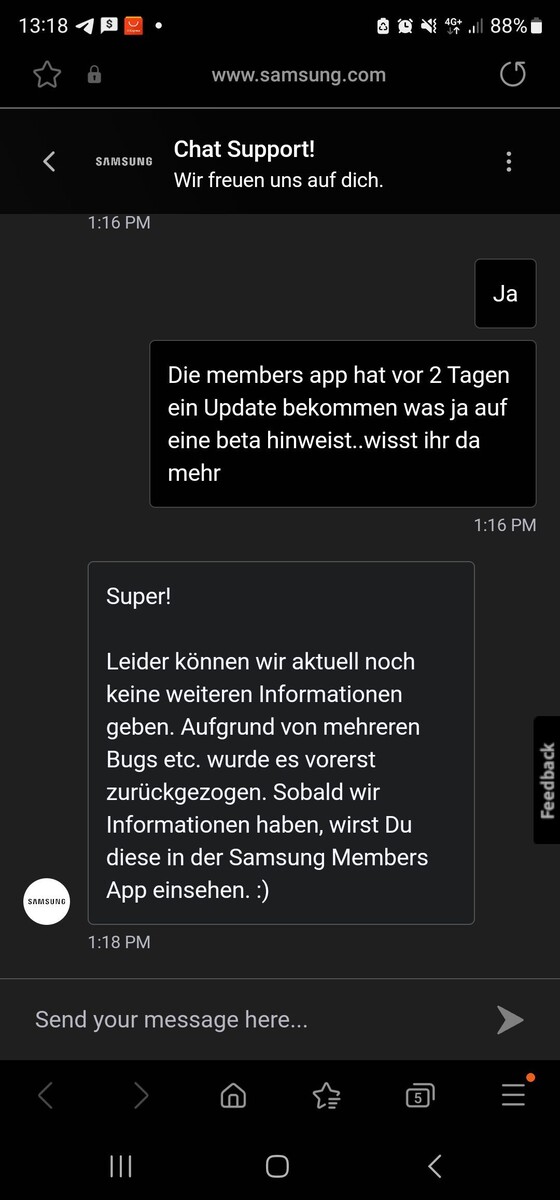In der deutschen Samsung-Community sind offenbar einige Galaxy S23-Nutzer bereits recht heiß auf den Start der One UI 6 Betaversion, die zuletzt für den 2. August 2023 avisiert war, sich bis dato aber noch nicht materialisiert hat. Ungeduldige Samsung-Fans haben bei Samsung Deutschland nachgefragt und auch eine Antwort erhalten, wie ihr im Chatverlauf unten sehen könnt. Demnach wurde die erste Betaversion aufgrund einiger Fehler vorerst zurückgezogen, wann es nun wirklich mit dem Android 14 Test auf Galaxy S23, Galaxy S23+ und Galaxy S23 Ultra (hier bei Amazon verfügbar) losgeht, ist demnach weiterhin offen.
