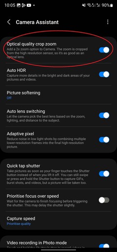 Neben vielen Detailverbesserungen und Qualitätsoptimierungen steht insbesondere der von Samsung als "Crop-Zoom" bezeichnete In-Sensor-Zoom mit neuer 2x Stufe in der Kamera-App im Fokus. Wer direkt nach dem Update keinen entsprechenden 2x Zoombutton in der Kamera-App sieht, sollte noch den Camera Assistant im Galaxy Store laden und das Feature aktivieren (siehe Screenshot unten). Wie Tests gezeigt haben, erhöht sich die Qualität des 2x Zooms dadurch massiv.