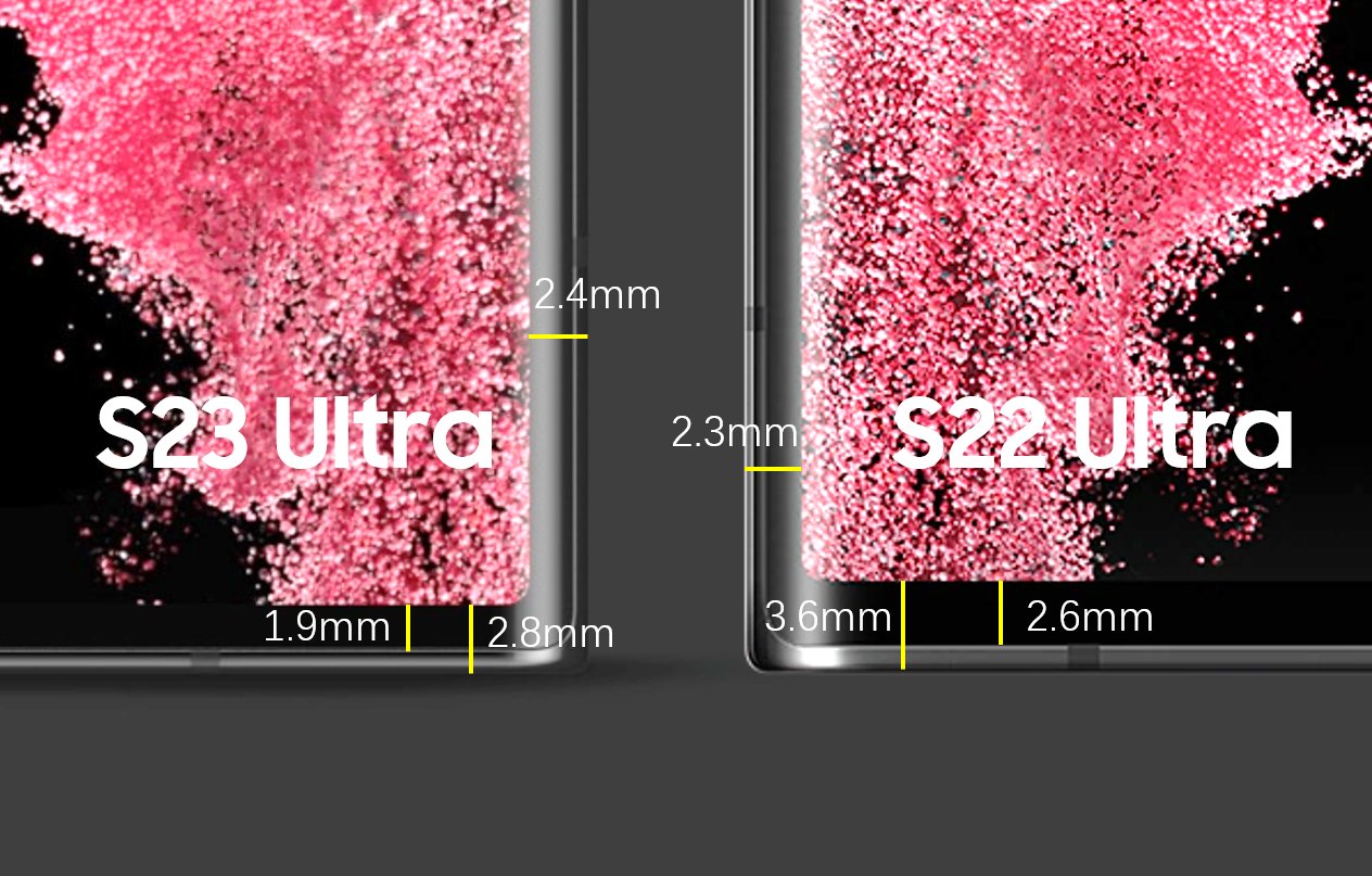 Der hat zwar den Wechsel vom Kamerabuckel zum einheitlichen Kamera-Design des Galaxy S22 Ultra (hier bei Amazon erhältlich) bei Galaxy S23 und Galaxy S23+ nicht vorhergesehen, liefert nun aber weitere, hoffentlich korrekte, Details zu den Änderungen an der Front des Galaxy S23 Ultra. Wie wir in seinen Vergleichsbildern oben und unten gut erkennen können, schrumpfen die Displayränder beim Top-Modell der Galaxy S23-Familie nochmal recht deutlich.