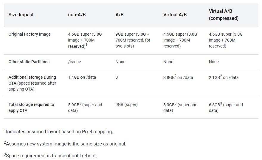 Grob handelt es sich hierbei um einen Android-Update-Prozess, der bequem im Hintergrund abläuft, beim Neustart wird dann zu einer zweiten Systempartition gewechselt, anstatt das Smartphone mehrere Minuten lang außer Gefecht zu setzen. Diese Methode hat abseits des Zeitgewinns weitere Vorteile für den Benutzer, etwa ein bequemes Restore der vorigen Android-Version falls das Update fehlschlägt. Die früheren Nachteile des bis zu doppelt so großen Platzbedarfs am begrenzten internen Speicher haben virtuelle und komprimierte A/B-Partitionen mittlerweile praktisch eliminiert, wie die Vergleichstabelle von Google unten zeigt.