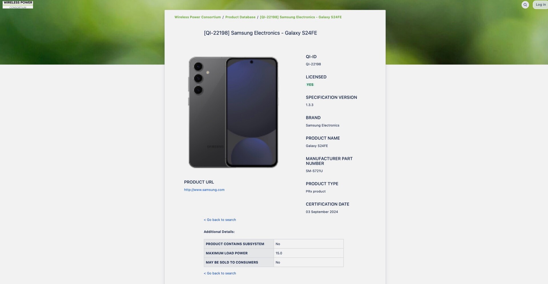 Mitte August sind bereits zahlreiche Promo-Bilder und die wichtigsten Spezifikationen des Samsung Galaxy S24 FE geleakt, nun bestätigt ein Eintrag beim Wireless Power Consortium (WPC) das Design des Smartphones mehr oder weniger offiziell. Denn die günstigere Alternative zum Galaxy S24 (ca. 800 Euro auf Amazon) hat am 3. September eine Qi-Zertifizierung unter der ID "QI-22198" erhalten.