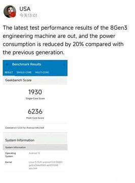 Mit vermeintlichen 1930 Punkten im Single-Core und 6236 Punkten im Multicore-Test überzeugt das potentielle Ergebnis auf voller Linie, zudem soll Qualcomm die Effizienz im Vergleich zum aktuellen Flaggschiff-Chip weiter deutlich erhöht haben, konkret ist im Post von 20 Prozent Einsparungspotential die Rede. Hierbei ist nicht zu vergessen, dass bereits der bei TSMC gefertigte Snapdragon 8 Gen 2 deutlich gegenüber dem Snapdragon 8 Gen 1 aus 2021 verbessert wurde, in Sachen Geekbench-Performance liefert er durchschnittlich etwa 1490 Punkte im Single- und 5160 Punkte im Multicore-Score.