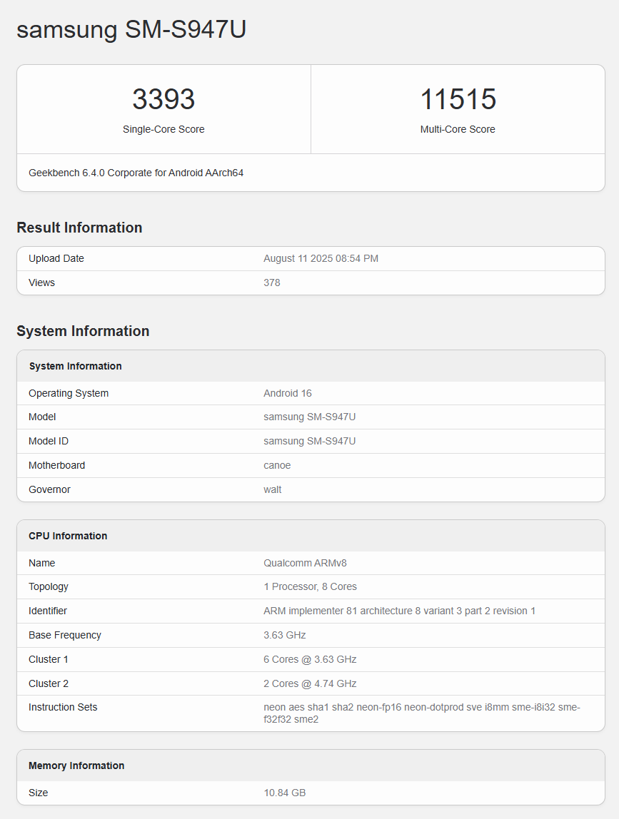 Im Gegensatz zu dieser werden nun Scalable Matrix Extensions (SME) unterstützt, was ebenfalls mehr Performance verspricht. Als GPU ist eine Adreno 840 verbaut, das SM-S947U Testmodell ist ein Muster für den US-Markt, hat 12 GB RAM an Bord und läuft mit Android 16. Ein Beweis für einen Snapdragon 8 Elite 2 im Galaxy S26 Edge für Europa ist dieser Geekbench-Leak somit nicht. Hierzulande könnte durchaus auch ein Exynos 2600 im Galaxy S26 und Galaxy S26 Edge stecken, der es bis auf die GPU-Performance vermutlich schwer haben wird, mit einem tatsächlich auf 4,74 Ghz taktendem Snapdragon 8 Elite 2 mitzuhalten.