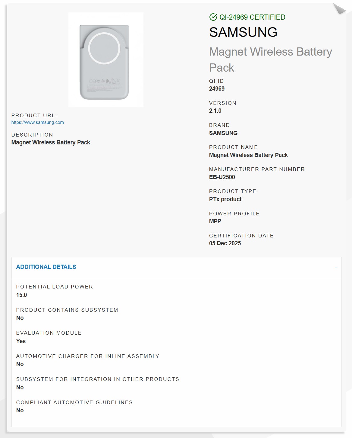 Da wäre einmal eine Wireless Charging Powerbank von Samsung mit der Modellnummer EB-U2500, die in der Datenbank des Wireless Power Consortiums entdeckt wurde und immerhin 15 Watt per Qi2 2.1 kabellos zur Verfügung stellen kann. Dass Samsung neben 60 Watt Fast-Charging via USB-C beim Galaxy S26 Ultra auch 25 Watt kabellos unterstützen wird, bekräftigt auch ein neues Ladegerät mit der Nummer EP-P2900, das von Roland Quandt entdeckt wurde. Wie dieser Samsung Magnetic Wireless Charger aussehen wird, ist noch nicht bekannt, bei der neuen Qi2-Powerbank kann man sich auf der WPC-Webseite aber bereits ein erstes Bild machen.